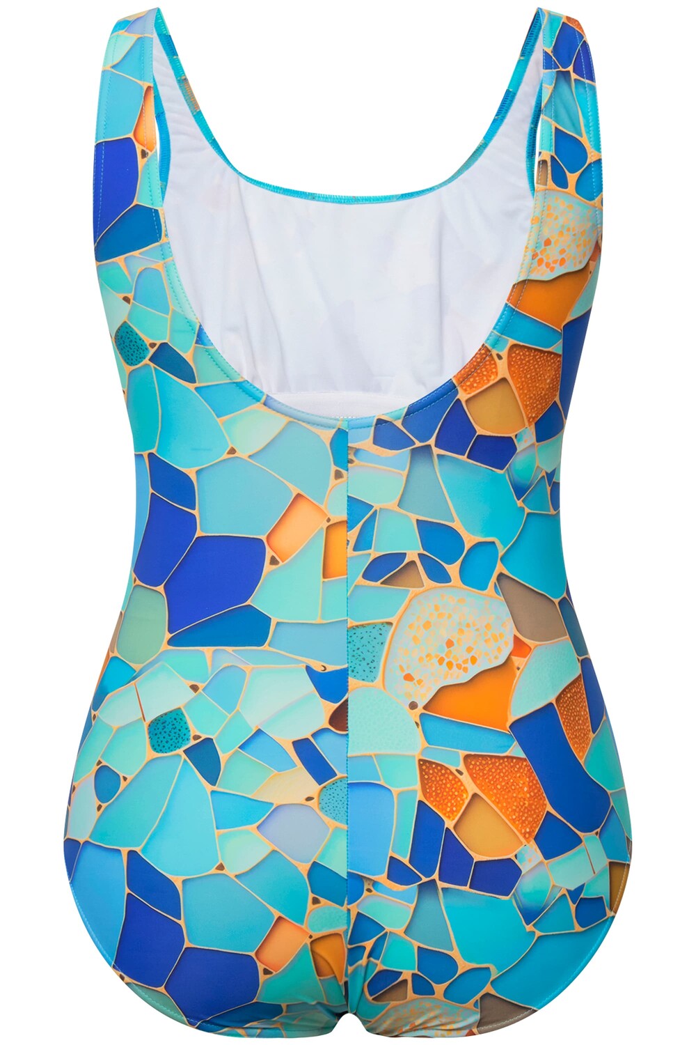 Купальник без мягких чашек, с геометрическим принтом по всей поверхности. Круглый вырез горловины, пояс под грудью, очень мягкая передняя подкладка.