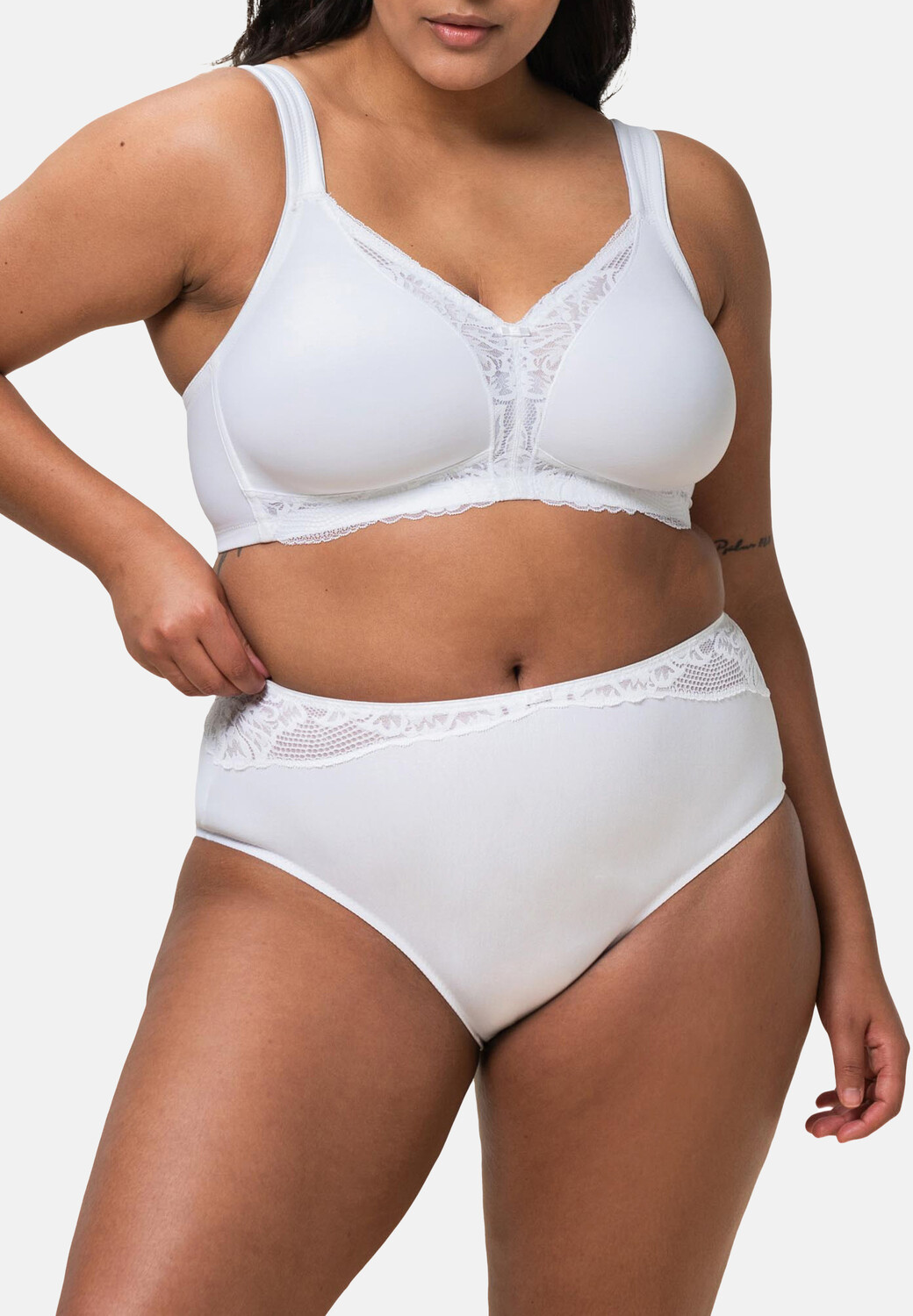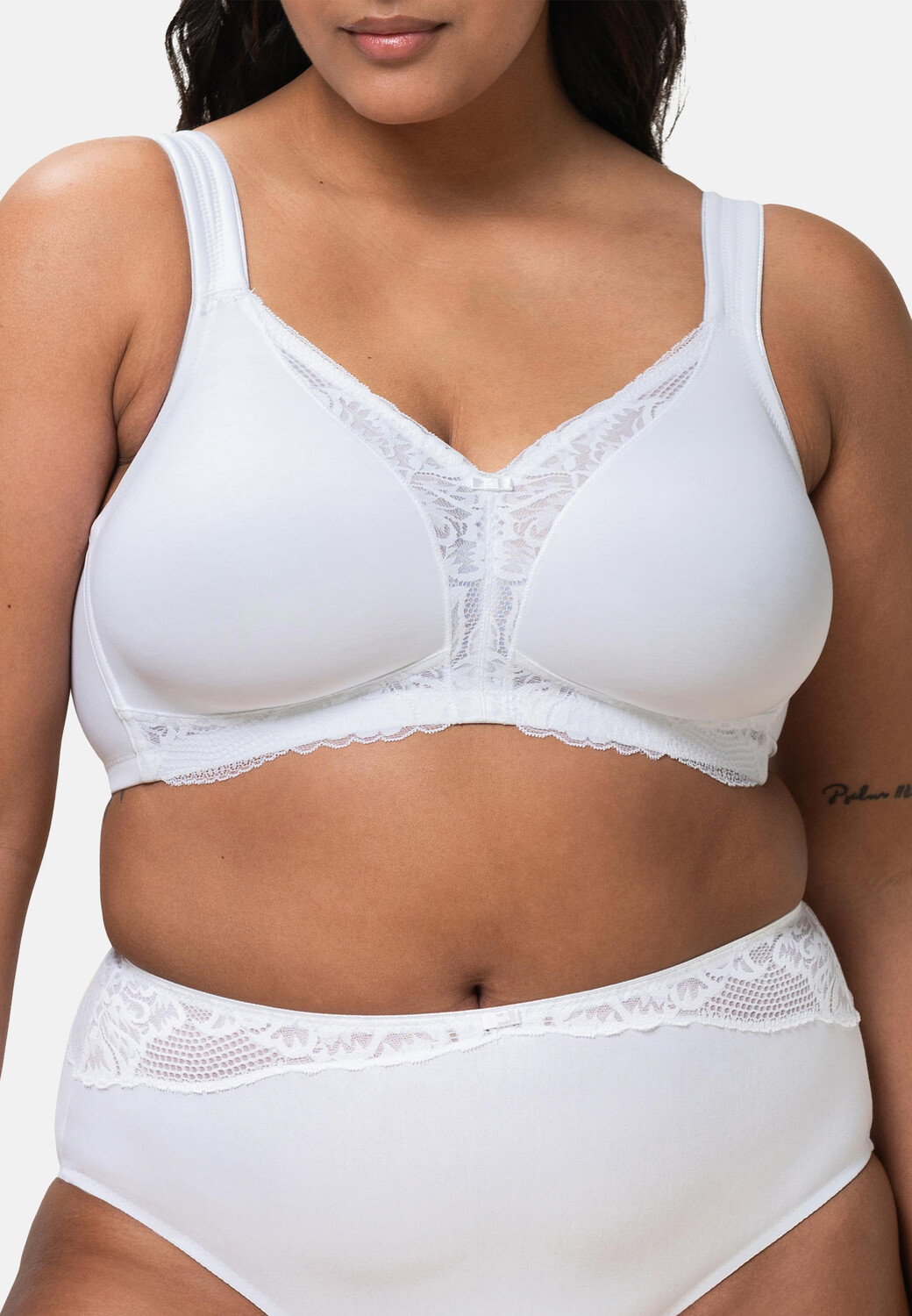Этот удобный бюстгальтер без косточек из серии Modern Lace + Cotton умело подчеркивает вашу грудь и поэтому должен быть в каждом гардеробе. Визуально бюстгальтер отличается тонкими плоскими кружевными деталями, а также впечатляет своей особенно прочной фиксацией. Конечно, не забыт и комфорт ношения, который гарантируют хлопковые чашечки и широкие бретели.