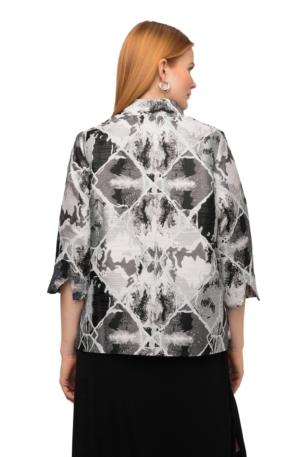 Блейзер свободного кроя из высококачественной жаккардовой ткани с инновационным клетчатым дизайном и элегантным металлическим эффектом. Свободный крой с воротником-стойкой, декоративными пуговицами и рукавами-тюльпанами 3/4. Подкладка полностью.