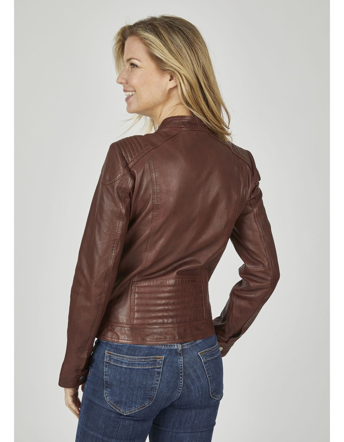Эта спортивная женская кожаная куртка от 7eleven изготовлена из тонкой кожи ягненка наппа растительного дубления. Воротник-стойка, декоративная простежка на плечах и спине, а также закрывающиеся на кнопку боковые карманы создают повседневный образ. Трубопровод является дополнительным привлекательным элементом. Современный крой этой кожаной куртки обеспечивает идеальную посадку и прекрасно подчеркивает вашу фигуру.
