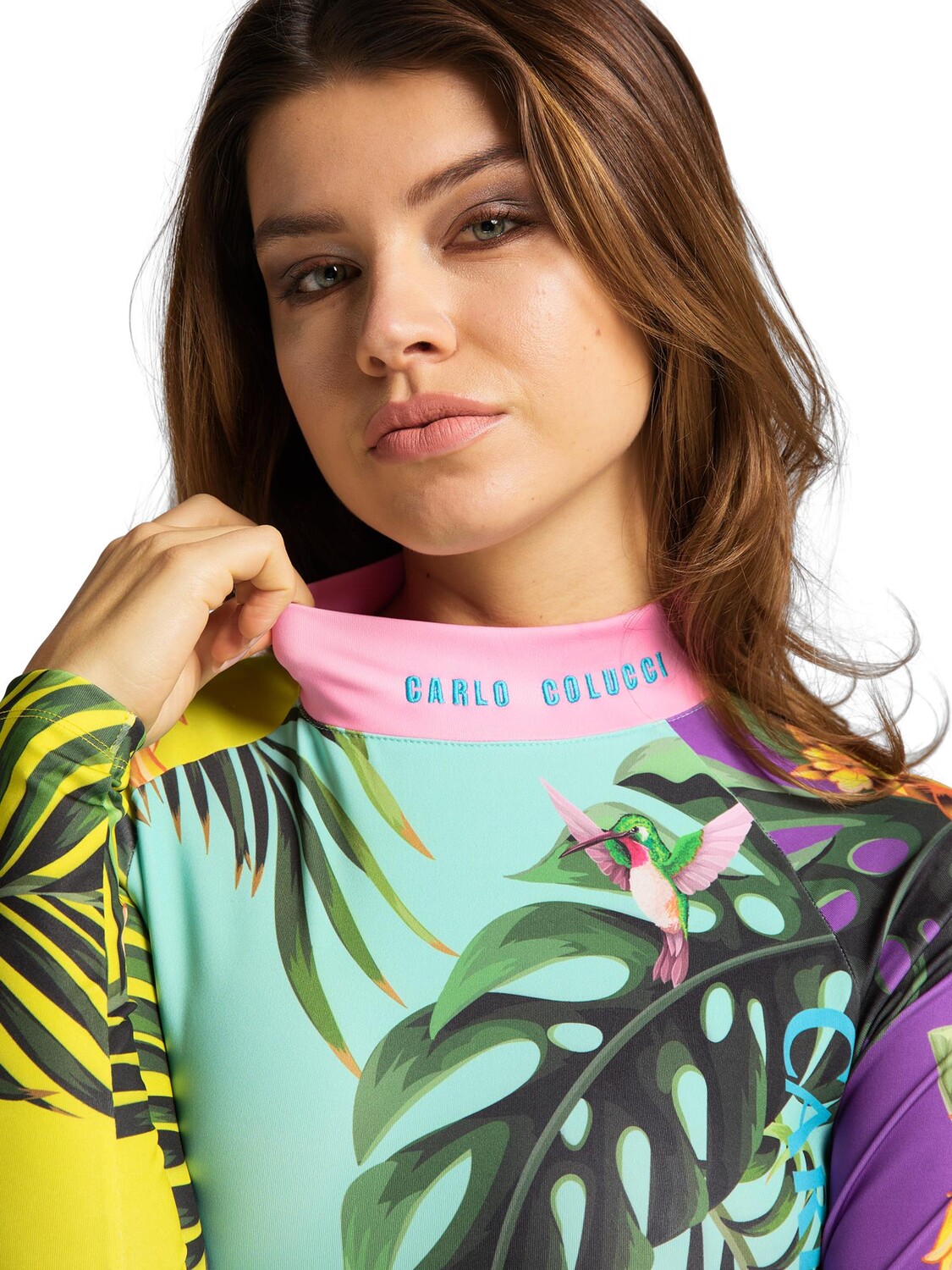Это модное боди впечатляет тропическим принтом ярких цветов, контрастными манжетами на шее и надписью CARLO COLUCCI спереди и сзади. Он идеально подходит для занятий спортом и досуга. Для создания законченного образа ее можно легко комбинировать с шортами, леггинсами или блузоном в тон.