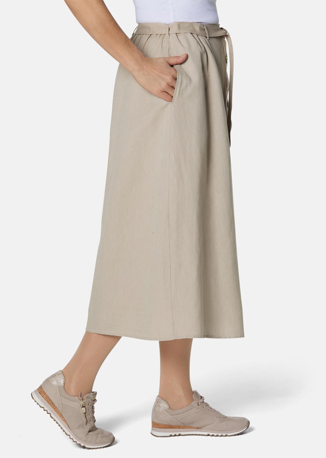 Юбка, которая радует женственным силуэтом и стильным качеством. Узкая планка с пуговицами, подобранные по цвету швы и ремень на эластичном поясе — приятные детали. Благодаря смеси льна, балансирующей температуру, качество очень высокое и комфортное в ношении. Его можно застегнуть спереди на красивые пуговицы, а ремешок придаст образу завершающий штрих. Длина около 80 см по размеру. 46, размер около 76 см. 23.