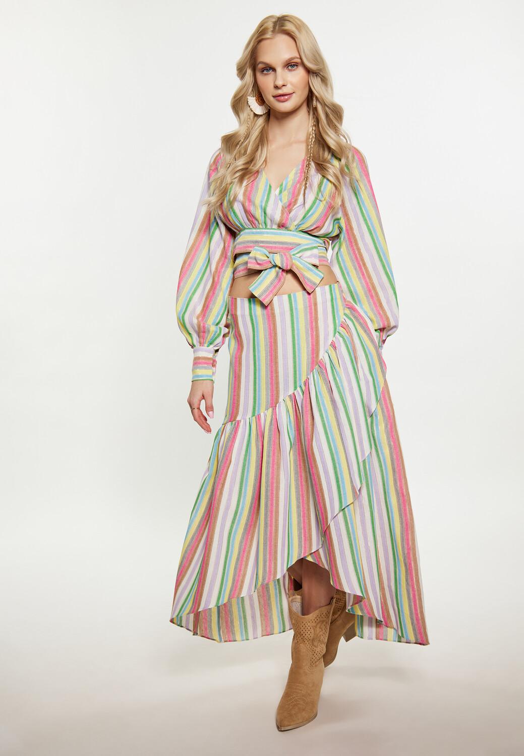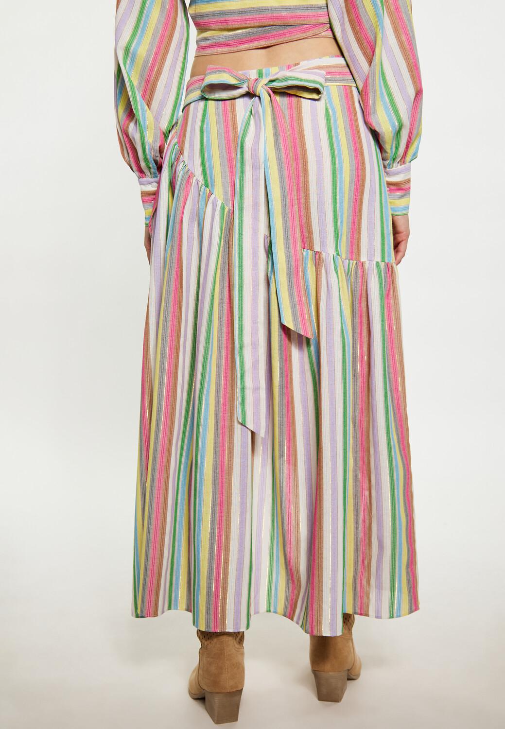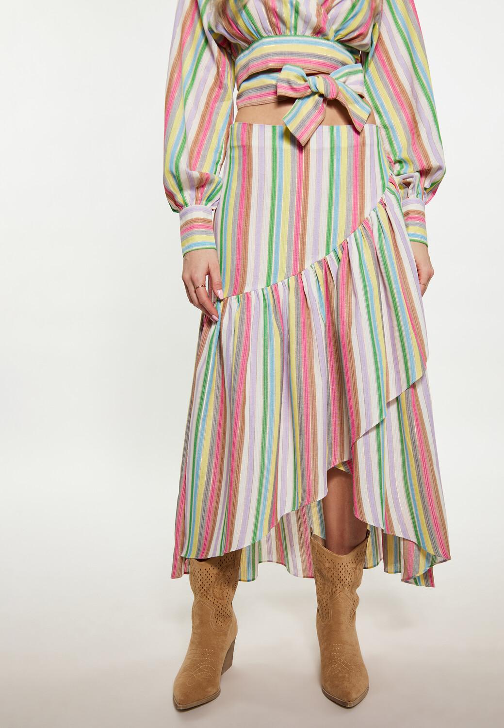 Представляем наше последнее пополнение женской модной коллекции — потрясающую юбку в вертикальную полоску. Асимметричный крой и детали с рюшами придают дизайну объемность и динамичность, а пояс дополнен завязкой, которую можно стилизовать в виде банта, придавая нотку женственности. Неровный край придает этому легкому куску ткани игривый и струящийся вид.