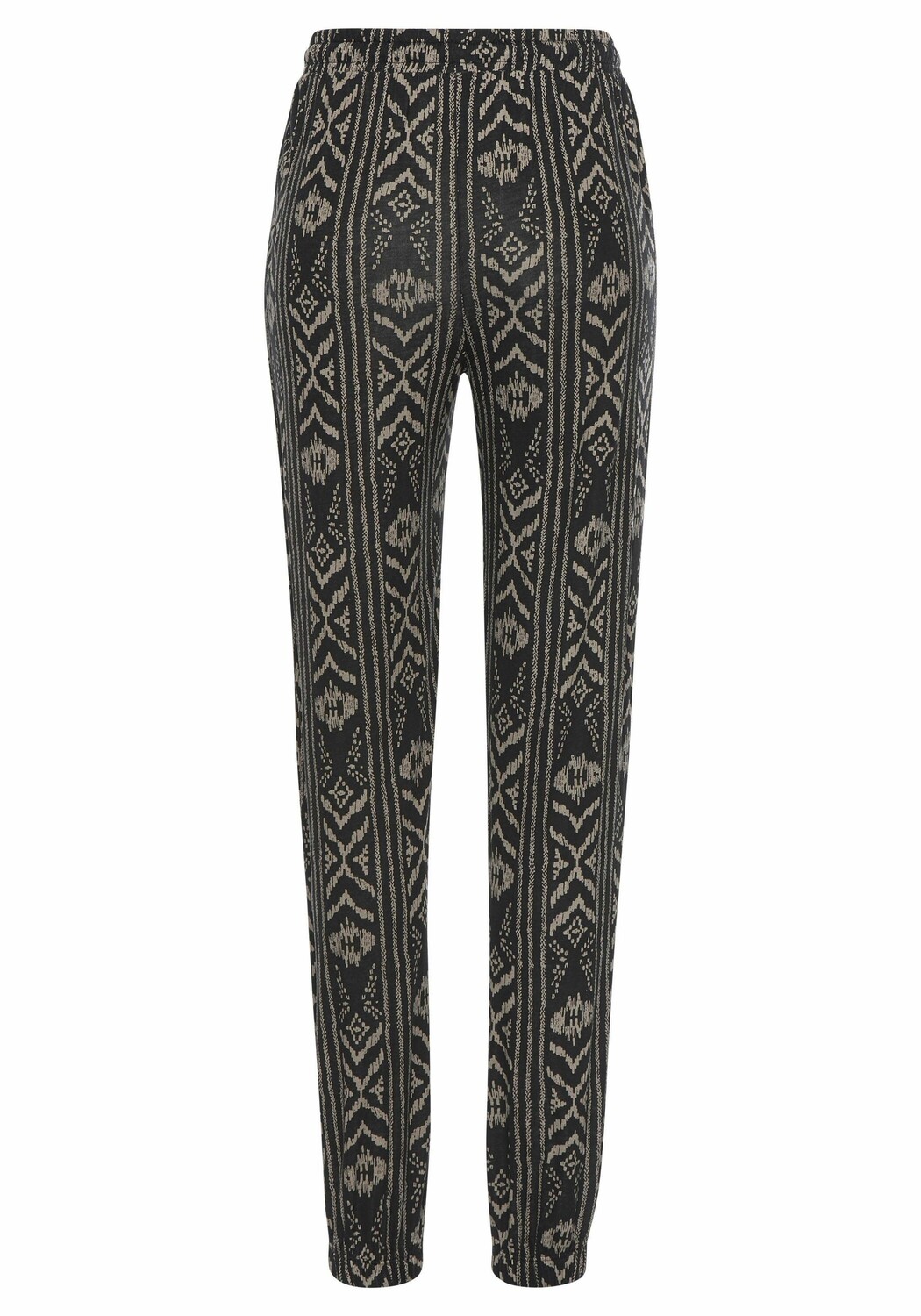 Трикотажные брюки LASCANA с принтом по всей поверхности, каждая деталь уникальна. С эластичным поясом и нижним краем. Декоративный шнур на манжетах. Внутренняя длина штанины около 76 см. Изготовлен из 100% вискозы.
