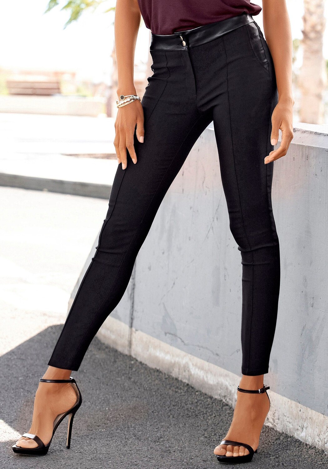 Брюки-стрейч от LASCANA. Приталенный крой со вставками из искусственной кожи вверху пояса и декоративными карманами сзади. Закрывается на кнопку и молнию. Длина по внутренней стороне штанины около 70 см.