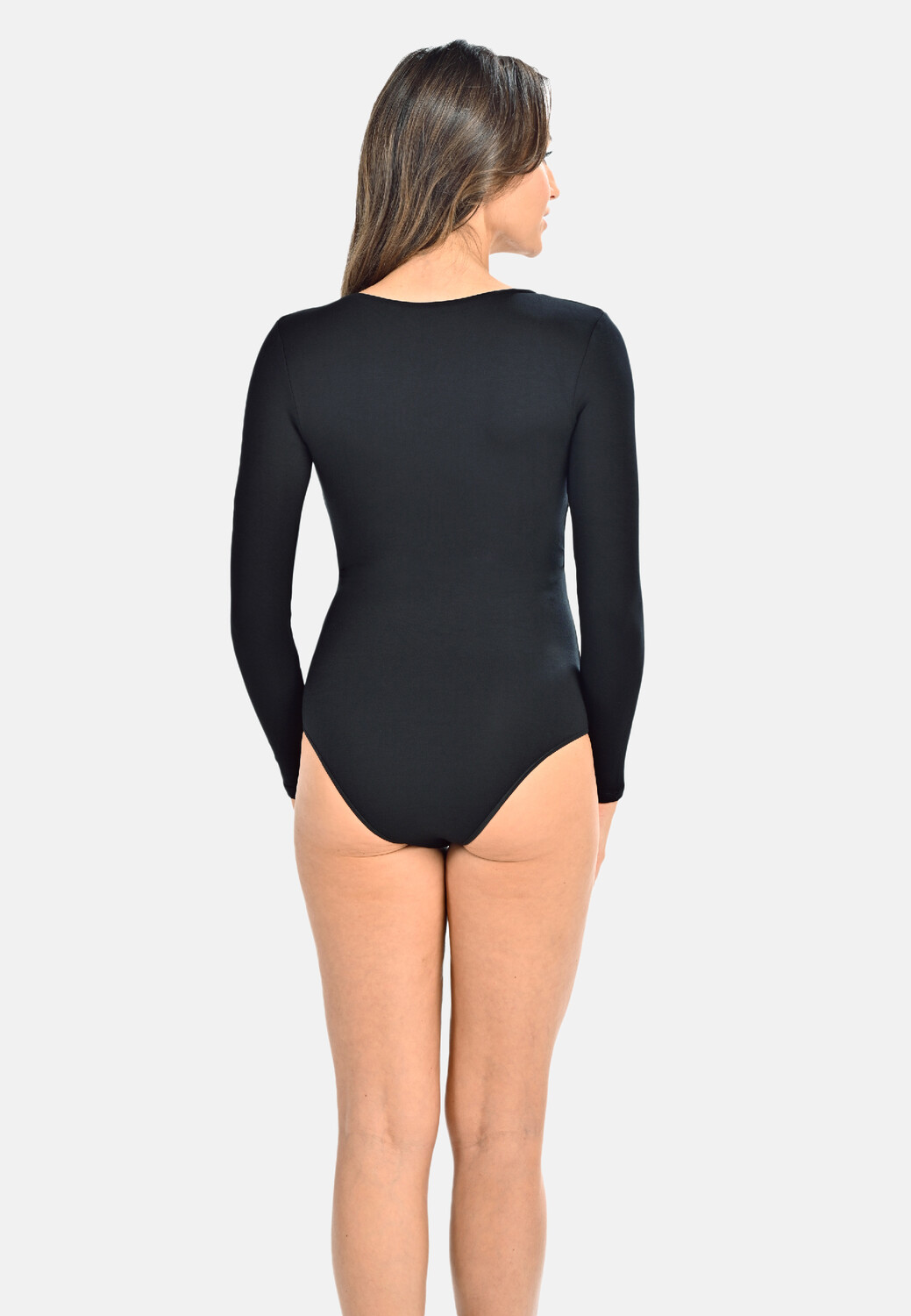 Черное приталенное женское боди. Оно выполнено из качественной, воздушной и комфортной вискозы, благодаря чему идеально адаптируется к силуэту и подчеркивает его достоинства. Боди имеет длинные приталенные рукава, которые стройнят и визуально удлиняют руки. Спереди V-образный вырез, который обнажает и подчеркивает грудь. В промежности застегивается на регулируемые крючки, благодаря чему его длину можно подогнать по силуэту. Это очень удобно для ежедневного использования. Он прекрасно сочетается с повседневным стилем с брюками, юбками и куртками. Такая модель боди – необходимый must-have каждой современной женщины, которая ценит внешний вид и комфорт. Боди выполнено в черном цвете — вневременном классическом цвете, который никогда не выходит из моды. Черный цвет также стройнит и подходит любому типу фигуры. Боди скроено так, чтобы подчеркнуть изгибы тела и создать красивый силуэт.