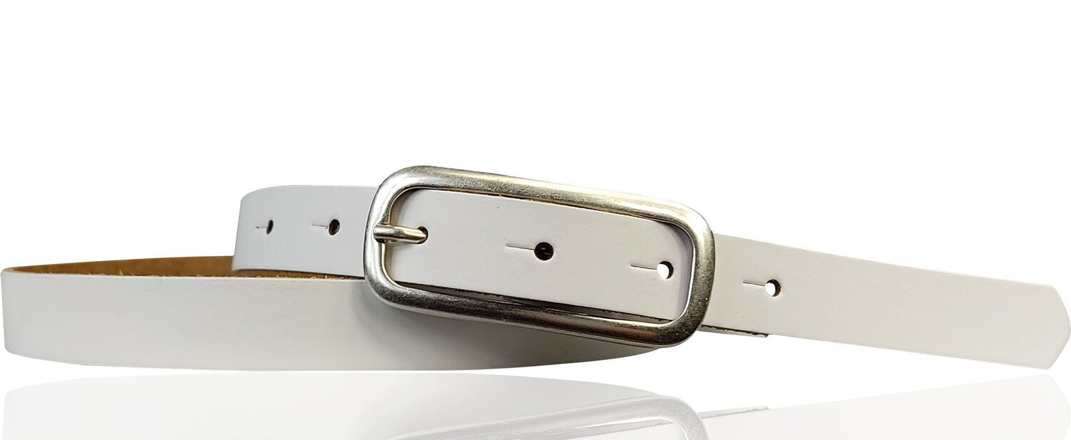 Классический узкий женский ремень с красивой удлиненной пряжкой. Ремешок шириной около 2 см изготовлен из натуральной кожи.