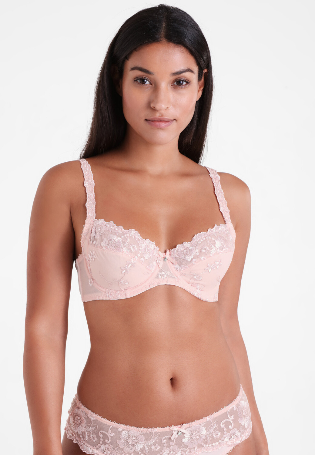 LASCANA: Бюстгальтер на косточках с кружевной вышивкой. Непрозрачная подкладка в нижней чашке. На ремешке тоже красивая вышивка. Регулируемые бретели и застежка сзади. Сексуальное белье. Кружевное белье. Романтическое белье. Игривое белье. Изготовлен из 78 % полиамида, 12 % полиэстера, 6 % хлопка, 4 % эластана. Бюстгальтеры не подходят для сушки в сушильной машине, так как регуляторы и кольца повреждаются под воздействием тепла и ломаются.