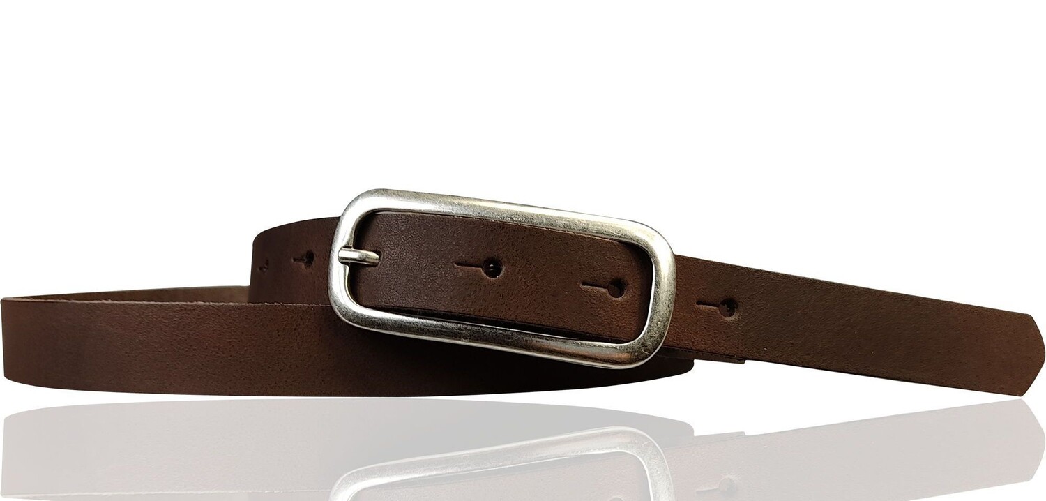 Классический узкий женский ремень с красивой удлиненной пряжкой. Ремешок шириной около 2 см изготовлен из натуральной кожи.