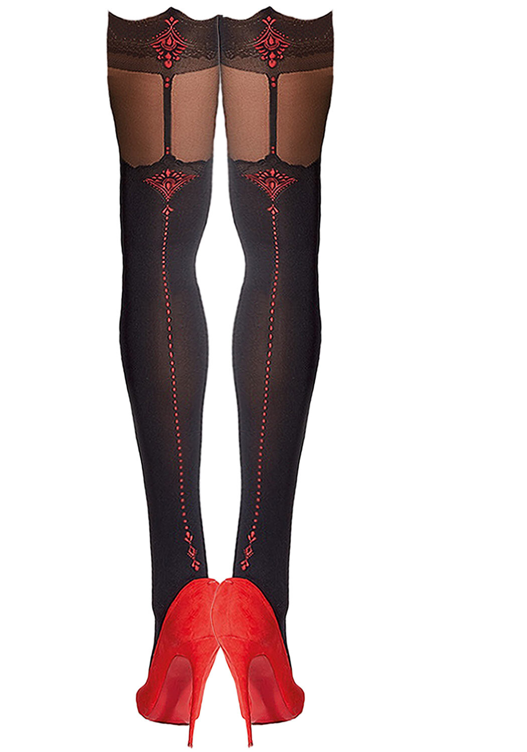 Колготки CECILE в дизайне StayUp со швом сзади из ткани 20/40DEN. Колготки украшены красным орнаментом и имеют красный задний шов. Цветовое сочетание привлекает внимание и придает образу необходимый шарм. Подчеркните свой неповторимый стиль и позвольте своим ножкам сиять в особых случаях.