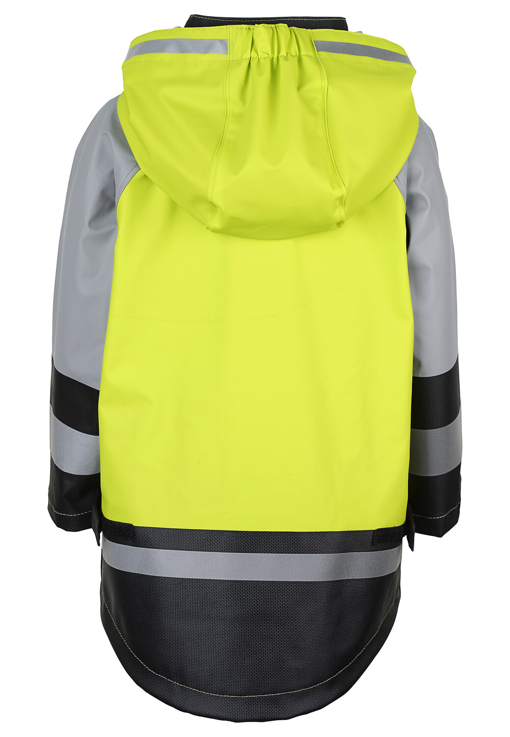 Водонепроницаемая функциональная куртка-дождевик с проклеенными швами, съемным капюшоном и прорезными карманами на молнии и планке на кнопках. Светоотражающий «логотип» и светоотражающие полосы на рукавах, спине, капюшоне и карманах. С дополнительным