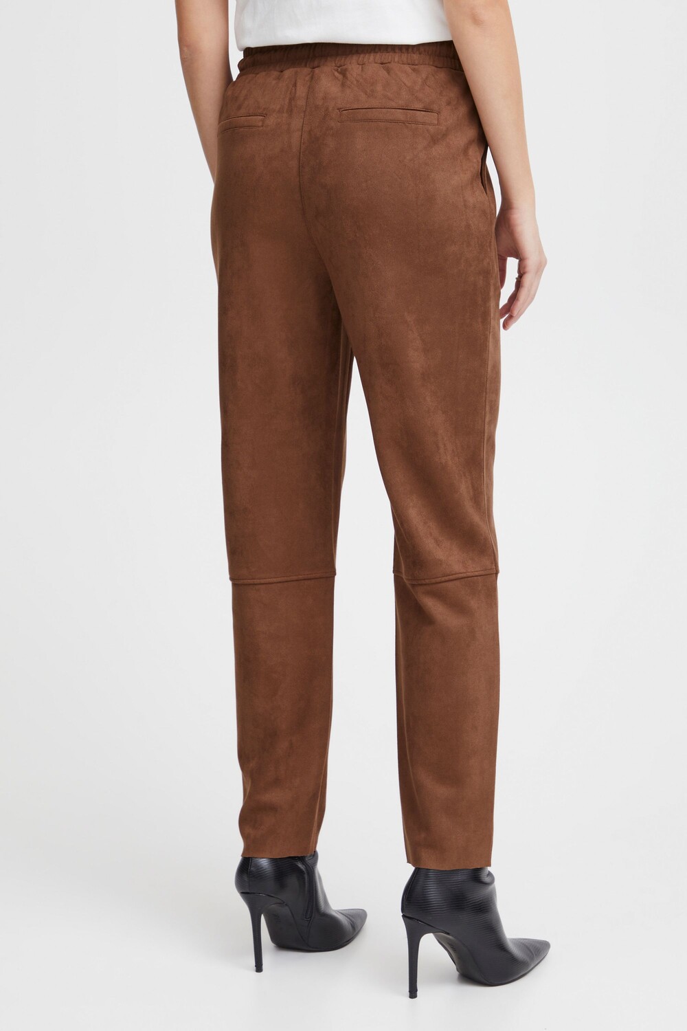 ДЕТАЛИ И ОСОБЕННОСТИ: два боковых кармана и два ложных кармана на окантовке, укороченные спортивные брюки под замшу, металлические люверсы и концы, удобная, мягкая, эластичная ткань, эластичный пояс с завязками, стандартная посадка, завышенная талия.