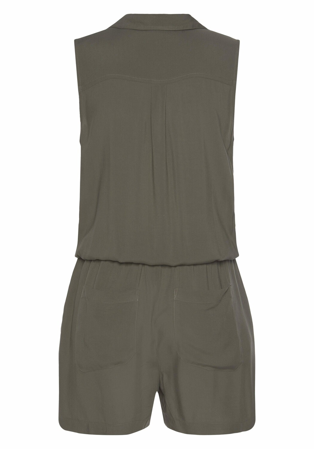 Короткий универсальный комбинезон от Lascana. Небольшой воротник и накладные нагрудные карманы для стиля. Эластичная лента с завязкой на уровне бедер для индивидуальной посадки. Карманы для рук с застежкой на пуговицы в качестве практичной детали. Отлично подходит для лета и отдыха. Мягкая ткань из вискозы.