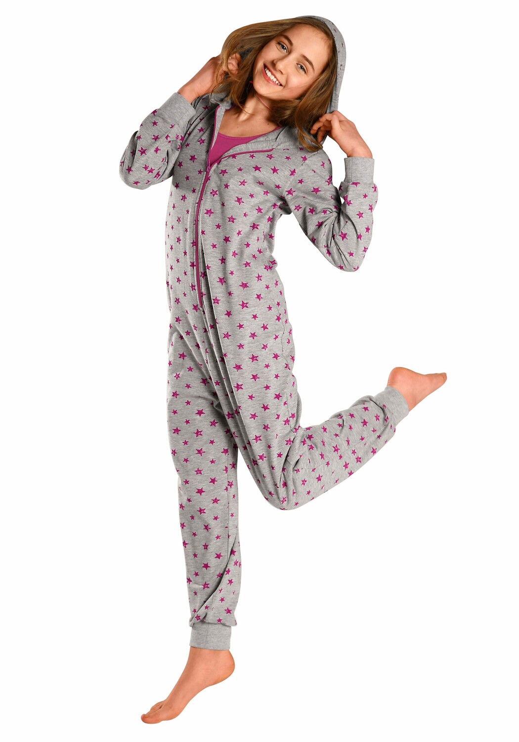 Милый комбинезон для объятий и отдыха. С красивым звездным принтом по всей поверхности. С капюшоном и молнией во всю длину контрастного цвета. Манжеты на рукавах и концах штанин. Изготовлен из 67 % хлопка, 33 % полиэстера.