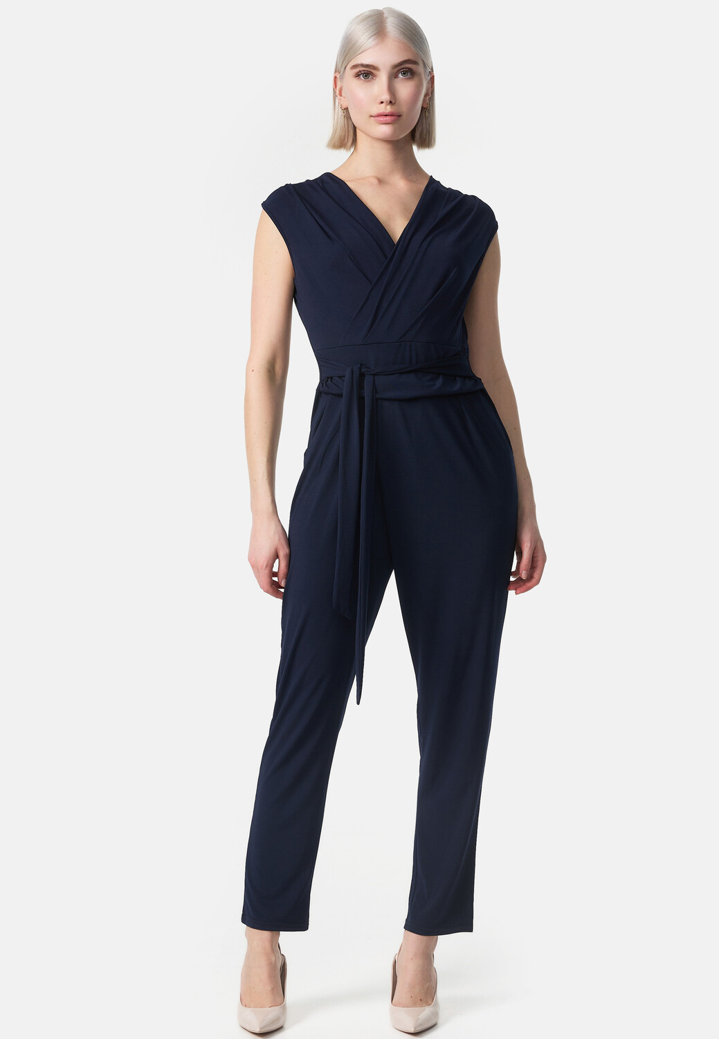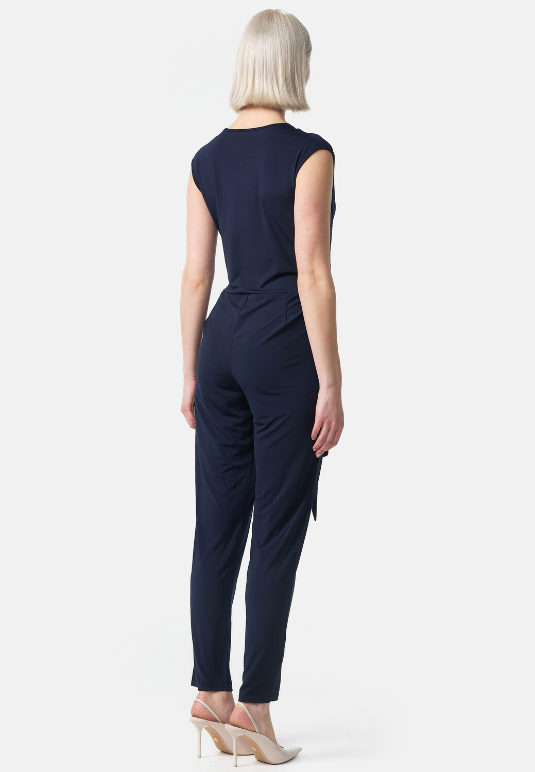 Элегантный женский комбинезон с V-образным вырезом и запахом. Повседневный, но элегантный брючный костюм для стильной женщины без рукавов, благодаря содержанию 5% эластана эластичен и адаптируется к фигуре. Гладкая ткань ниспадает мягкими складками и приятно охлаждает кожу. Высокий уровень комфорта дополняется поясом, с помощью которого можно подогнать комбинезон под соответствующий размер талии. Комбинезон подчеркивает ваш женственный силуэт и в то же время обеспечивает оптимальную свободу движений.