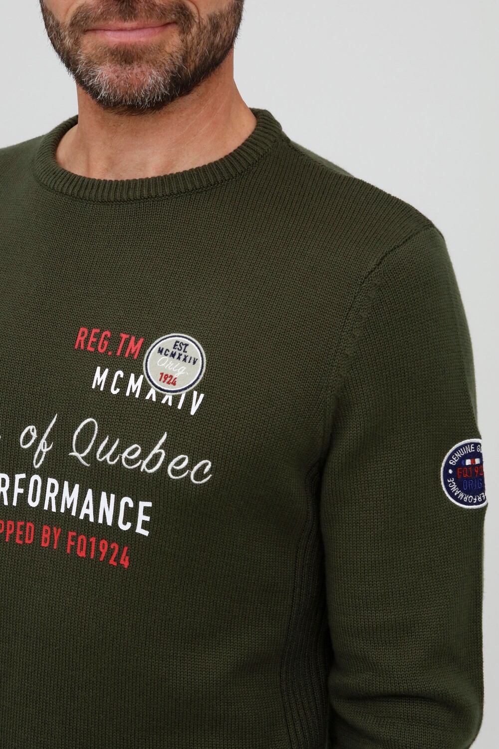 ДЕТАЛИ И ОСОБЕННОСТИ: свитер плотной вязки с круглым вырезом, трехцветная тесьма вокруг шеи, вышивка и принт на груди, тканевая нашивка по нижнему краю, нашивка с логотипом на левом плече, эластичные ребристые манжеты на воротнике и рукавах, приятная мягкость. и теплое качество, контрастный вязаный узор по бокам, удобная посадка в стандартной посадке