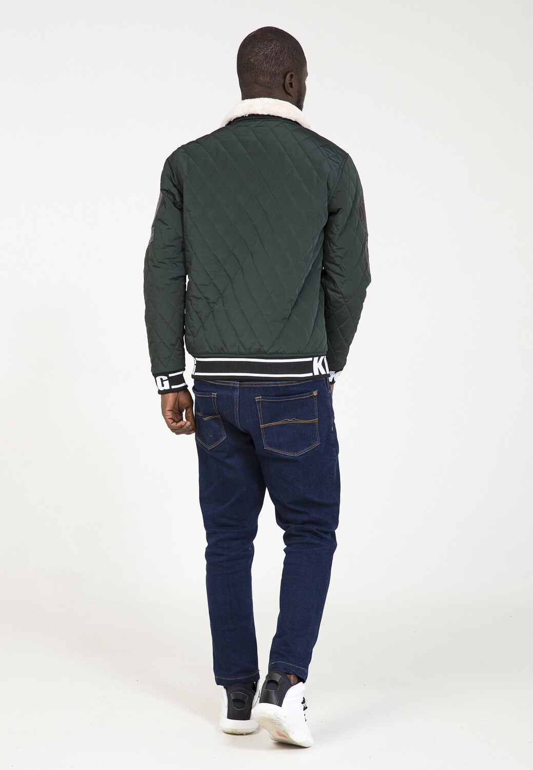 Эта мужская куртка-блузон выделяется воротником из искусственного меха и великолепной стежкой. Косые карманы с клапанами, ребристые манжеты по краю и рукавам, нашивки и золотистая молния.