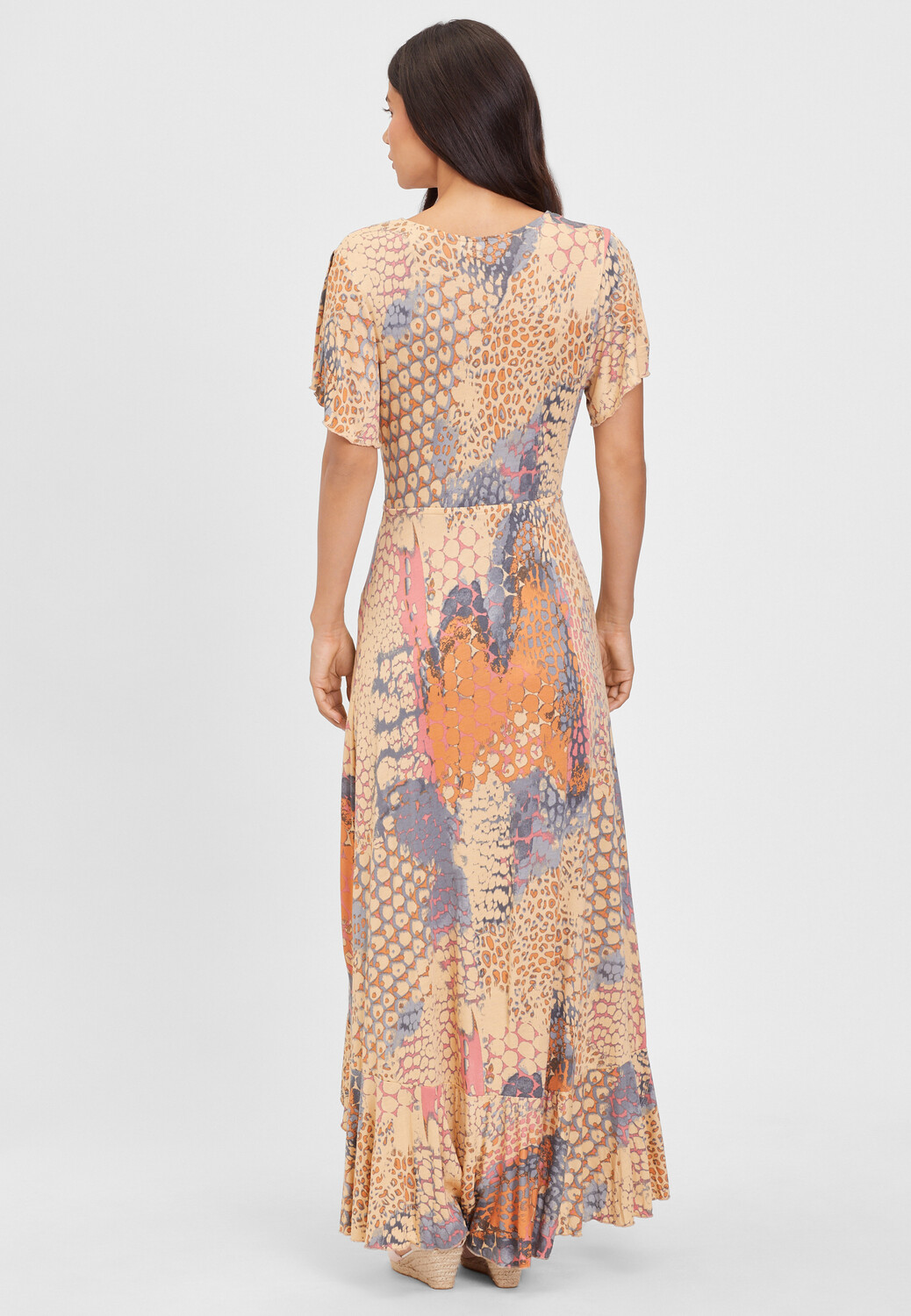 Платье-макси от BUFFALO с V-образным вырезом внахлест спереди. Эластичная талия. Часть юбки в форме кефали, сзади длиннее, чем спереди. Длинный разрез спереди слева. Длина юбки около 96 см. Изготовлено из трикотажной ткани.