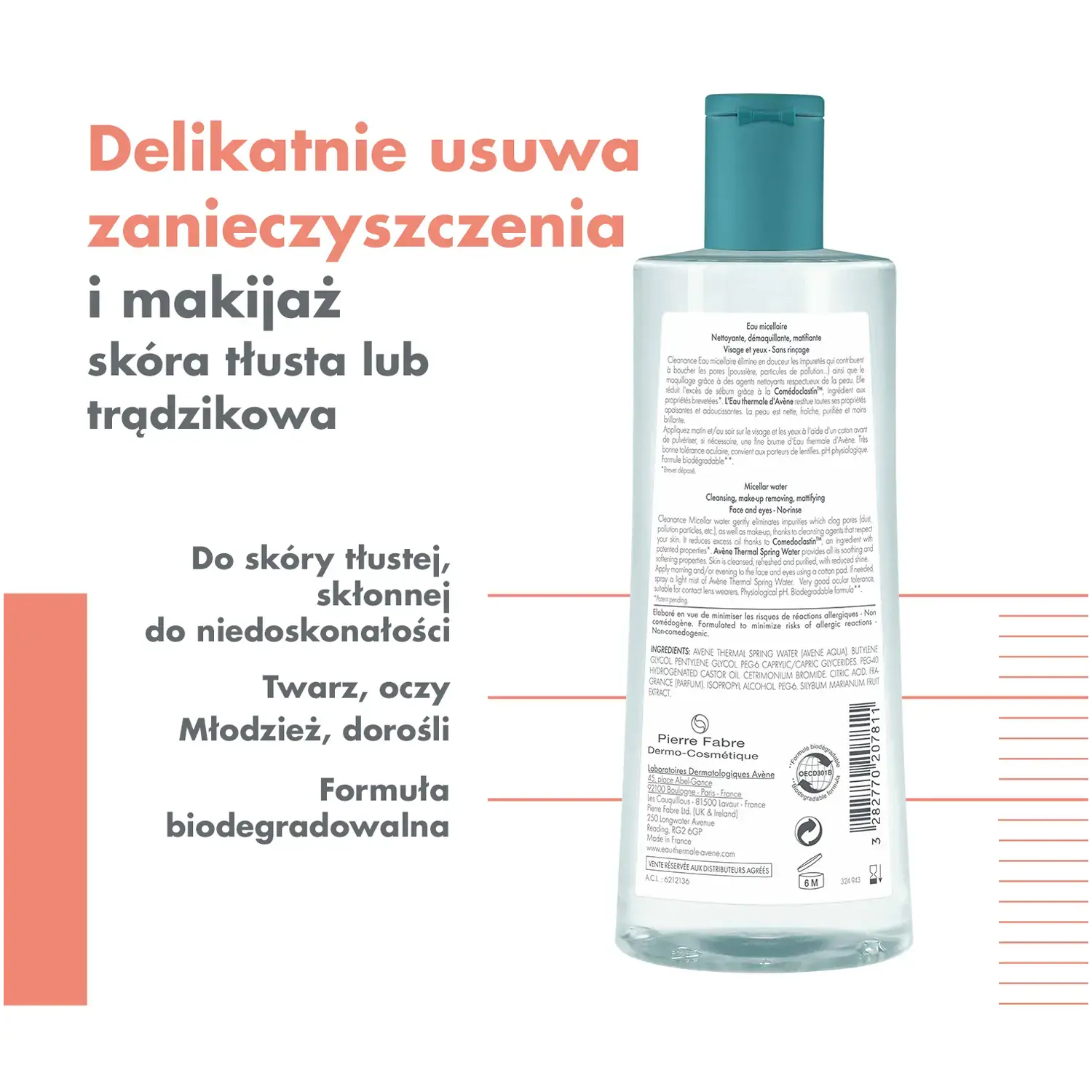 Очищение Мицеллярная вода для жирной кожи, склонной к несовершенствам, лица и глаз. Мягко удаляет закупоривающие поры загрязнения (пыль, загрязнения воздуха и т. д.) и макияж с помощью очищающих компонентов, не вызывающих раздражения кожи. Сокращает избыток кожного сала благодаря ComedoclastinTM, ингредиенту с запатентованными свойствами*. Термальная вода Avène оказывает успокаивающее и смягчающее действие. Кожа очищается и освежается, а «сияние» кожи уменьшается.