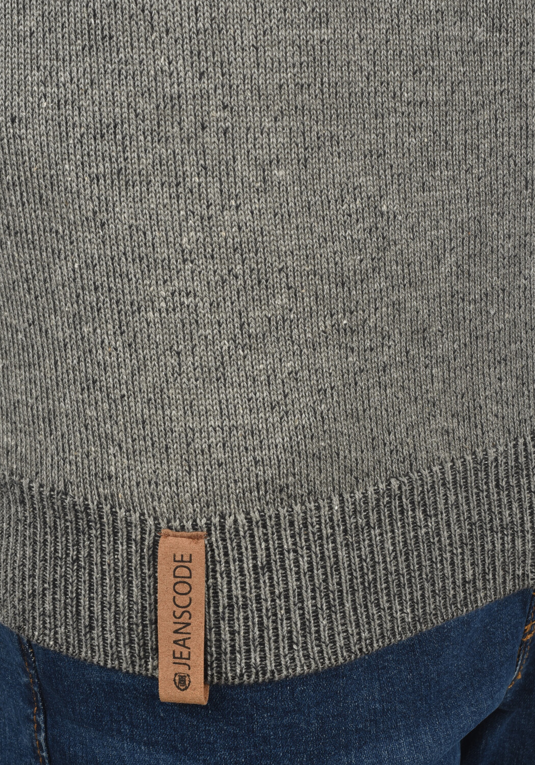 ДЕТАЛИ И ОСОБЕННОСТИ: Ребристый воротник-стойка, средний трикотаж в сетку, меланжевый вид, ребристые манжеты и подол, нашивка с логотипом из искусственной кожи на манжетах и задней части воротника.