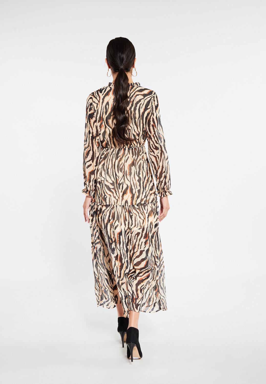 Золотые акценты, тигровый принт и оборки — вам понравится это платье макси от Faina. V-образный вырез и воротник с рюшами искусно украшают шею, а анималистический принт с золотыми акцентами привлекает внимание. На талии имеется резинка, которая особенно подчеркивает фигуру. Благодаря длине платья и длинным рукавам с рюшами на манжетах, которые придают игривый вид, платье легко комбинировать.