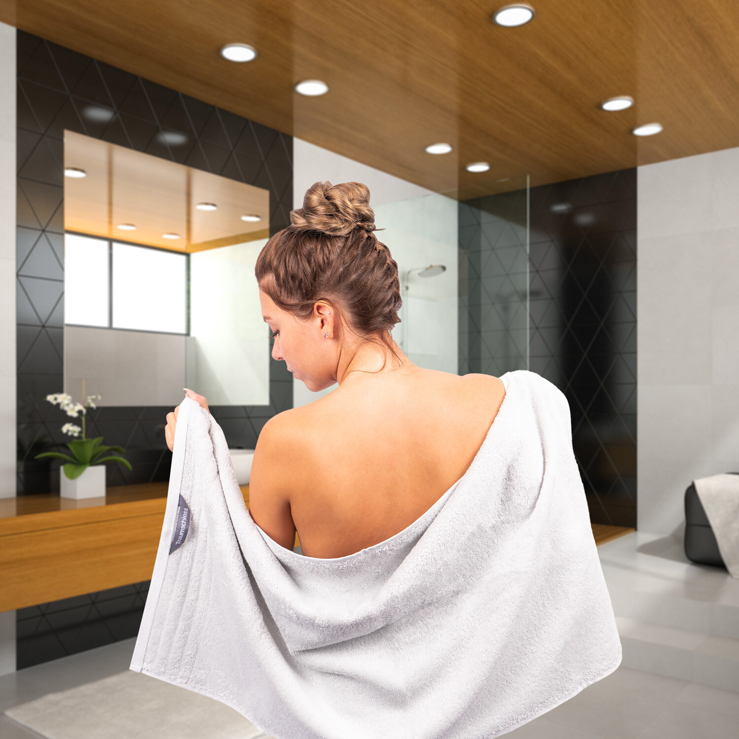 В ассортимент входят рукавицы для мытья, гостевые полотенца, полотенца для рук, полотенца для душа, банные полотенца и, конечно же, очень большое полотенце для сауны.