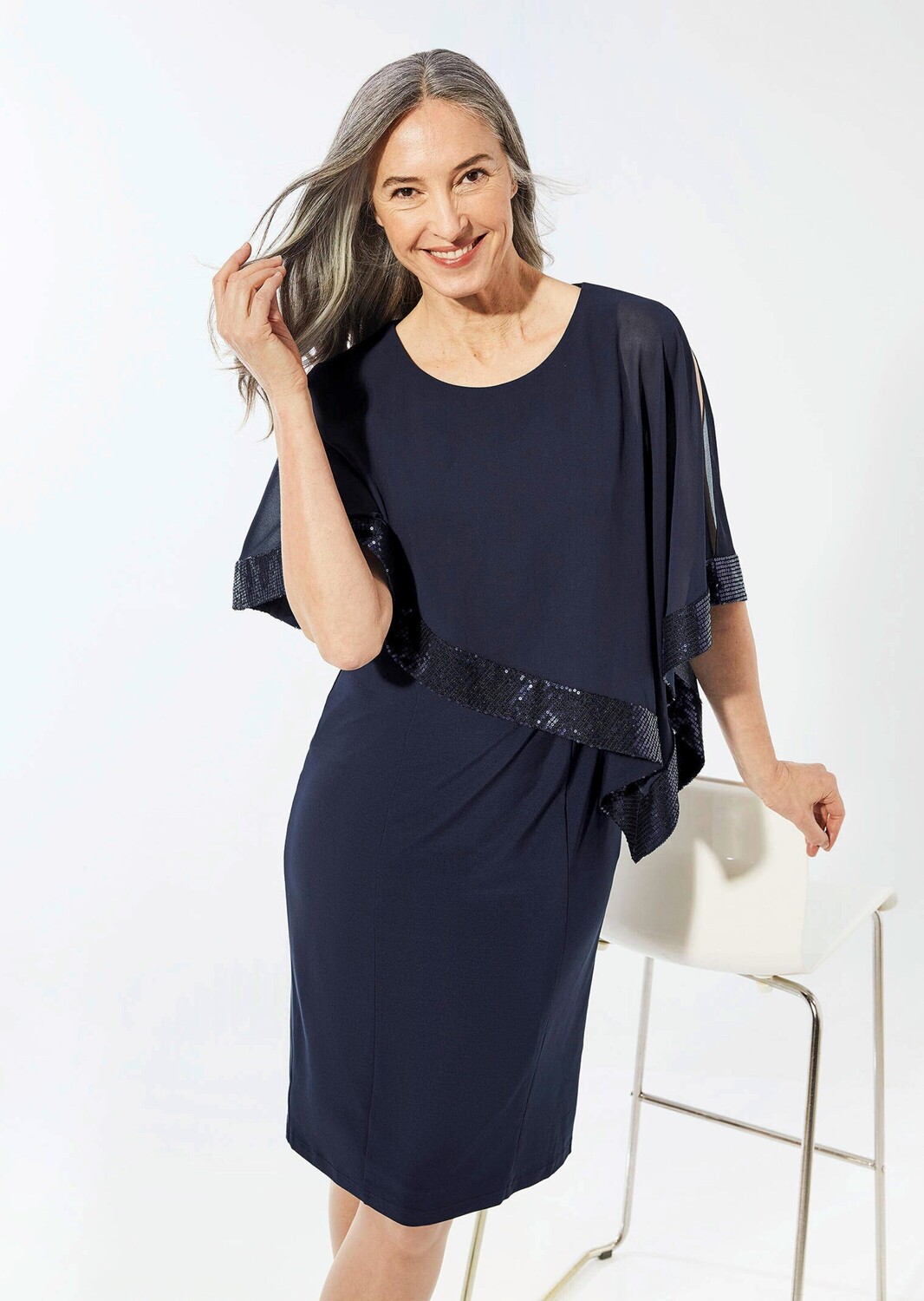 Платье выполнено из очень мягкого и эластичного трикотажа. Изысканный плед из шифона выглядит чрезвычайно элегантно и позволяет сквозь небольшие вырезы просвечивать плечи. Мерцающие пайетки украшают края и придают модели изысканный характер. Элегантной формы, подчеркивающей фигуру. Длина около 106 см по размеру. 46, размер около 101 см. 23.