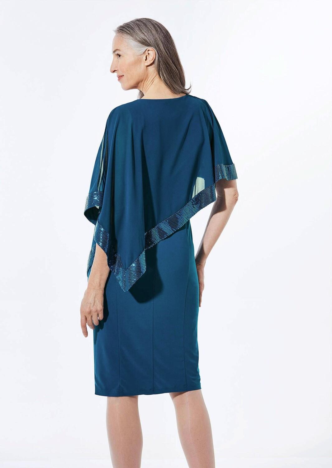 Платье выполнено из очень мягкого и эластичного трикотажа. Изысканный плед из шифона выглядит чрезвычайно элегантно и позволяет сквозь небольшие вырезы просвечивать плечи. Мерцающие пайетки украшают края и придают модели изысканный характер. Элегантной формы, подчеркивающей фигуру. Длина около 106 см по размеру. 46, размер около 101 см. 23.