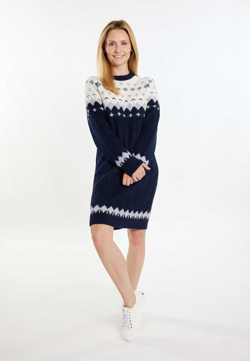 Сытный норвежский узор – настоящая классика, которая также очень популярна в этом зимнем сезоне. Трикотажное платье длины миди от уши BLUE LABEL связано типовым узором из мягкой смесовой пряжи и строго придерживается характерного норвежского правила: не более трех цветов в одной модели.