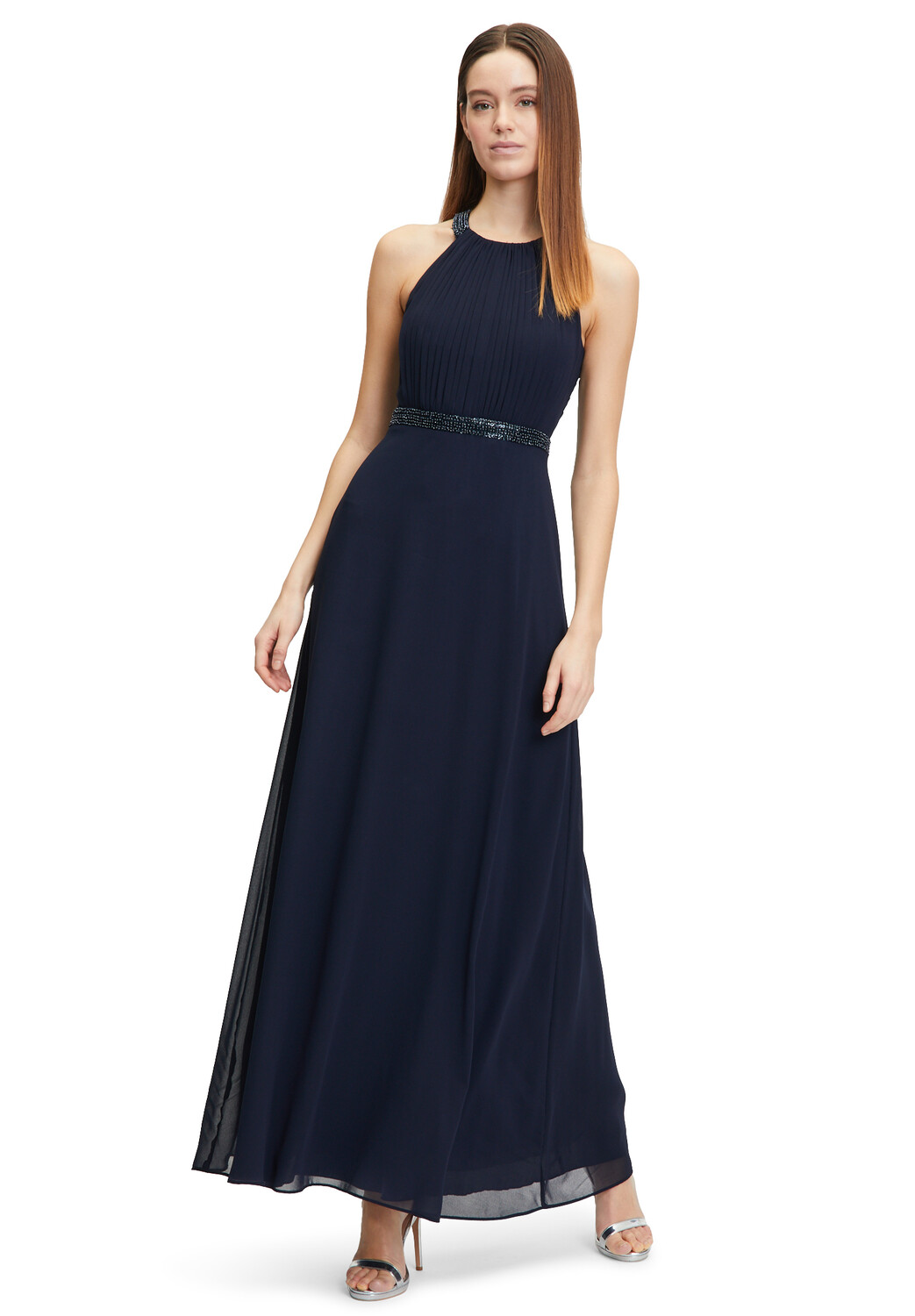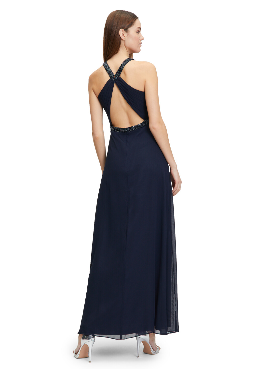 Благодаря этой детали вы привлечете всеобщее внимание. Облегающее фигуру вечернее платье из шифона с жемчугом на американском вырезе создает женственный шарм и привлекает всеобщее внимание красиво оформленным вырезом на спине. Облегающее фигуру платье-макси от Vera Mont идеально подойдет для торжественных случаев. Получите образ!