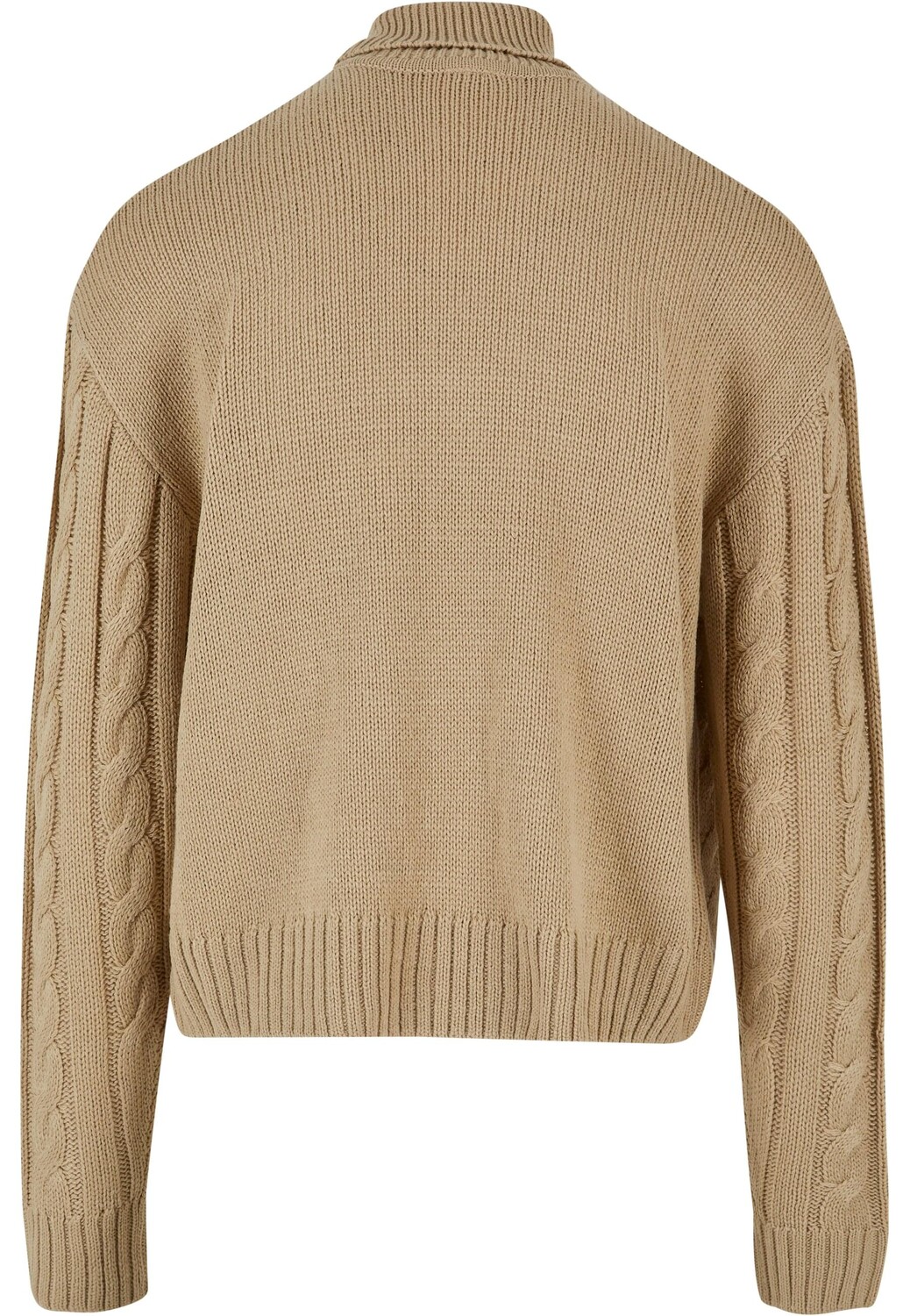 Мужской вязаный свитер имеет большую водолазку и расставляет акценты сменой узора. Рукава и перед вяжутся вертикальным косовым узором, спинка - простой. Широкие ребристые манжеты на рукавах и подоле завершают дизайн. Мужской вязаный свитер выполнен из прочного акрила, имеет объемный размер и имеет завышенные плечи.