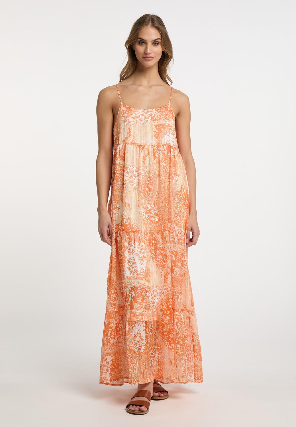 В макси-платье от IZIA вы можете приятно провести время в пляжном баре или взять модель с эффектным принтом в ночную жизнь Средиземноморья. Дизайн выполнен из блестящего полупрозрачного материала и отделан металлизированными нитями золотого цвета. Регулируемые бретельки-спагетти и несколько уровней воланов дополняют модель с принтом по всей поверхности, которая имеет подкладку с внутренней стороны для обеспечения непрозрачности.