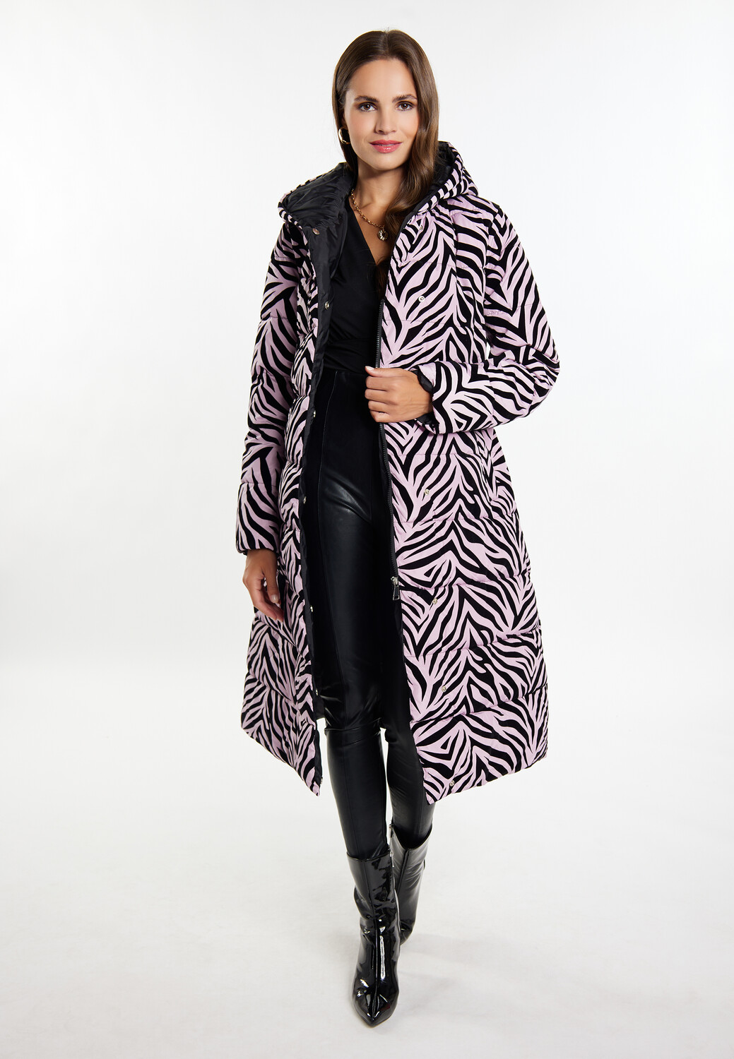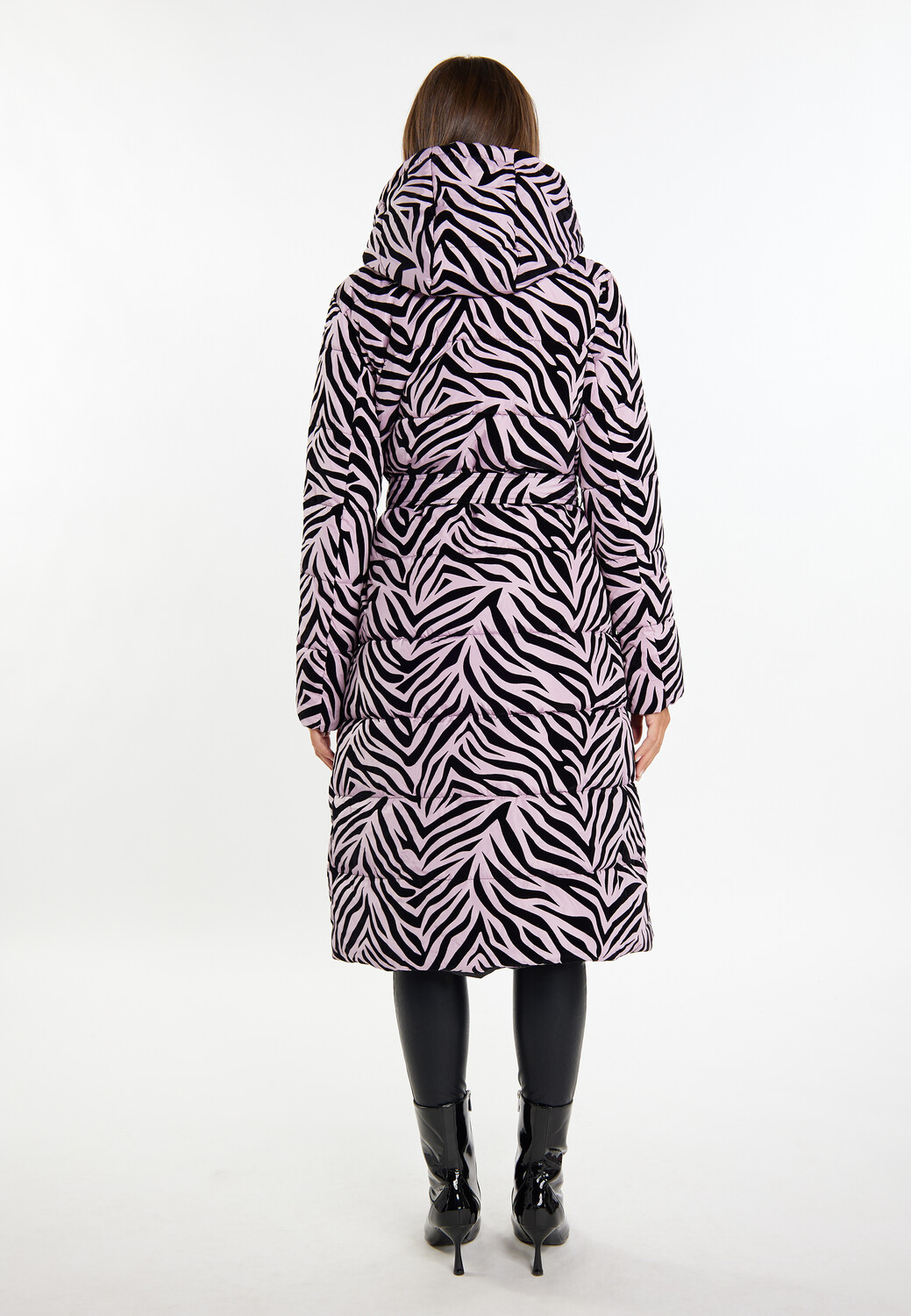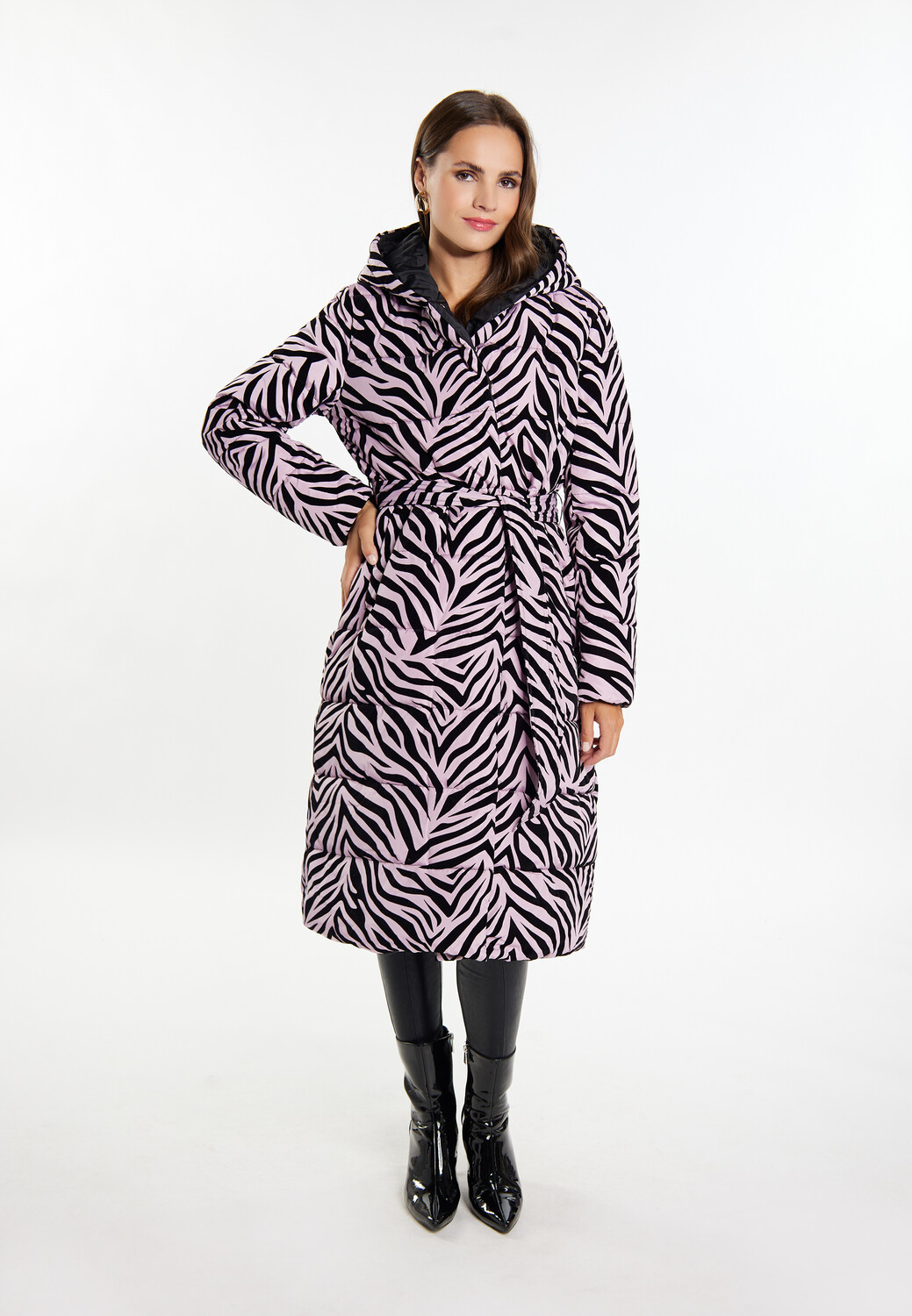 Слегка блестящее стеганое пальто от faina впечатляет своим зебровым принтом по всей поверхности, который гламурно сопровождает вас в холодные дни. Съемный ремень подчеркивает талию и придает еще больше формы силуэту с подкладкой. Небольшой воротник-стойка с капюшоном и потайная молния обеспечивают дополнительную защиту от ветра и непогоды.