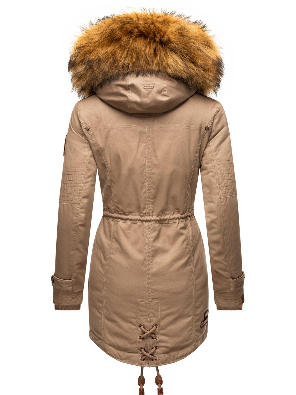 ВИД: Женская зимняя парка от Marikoo с мягким большим капюшоном из искусственного меха (съемный искусственный мех) и элегантной талией - идеальна для холодного времени года (осень и зима). МАТЕРИАЛ: Зимнее пальто из нескользящего хлопкового внешнего материала, теплое. внутренняя подкладка модно стегана - ощущается как ваше любимое пуховое одеяло, очень удобна в ношении. Посадка: парка для активного отдыха отлично подчеркивает фигуру благодаря красиво скроенному крою и кулиске на талии, большой длине по низу и крою «ласточкин хвост» (длиннее). сзади)