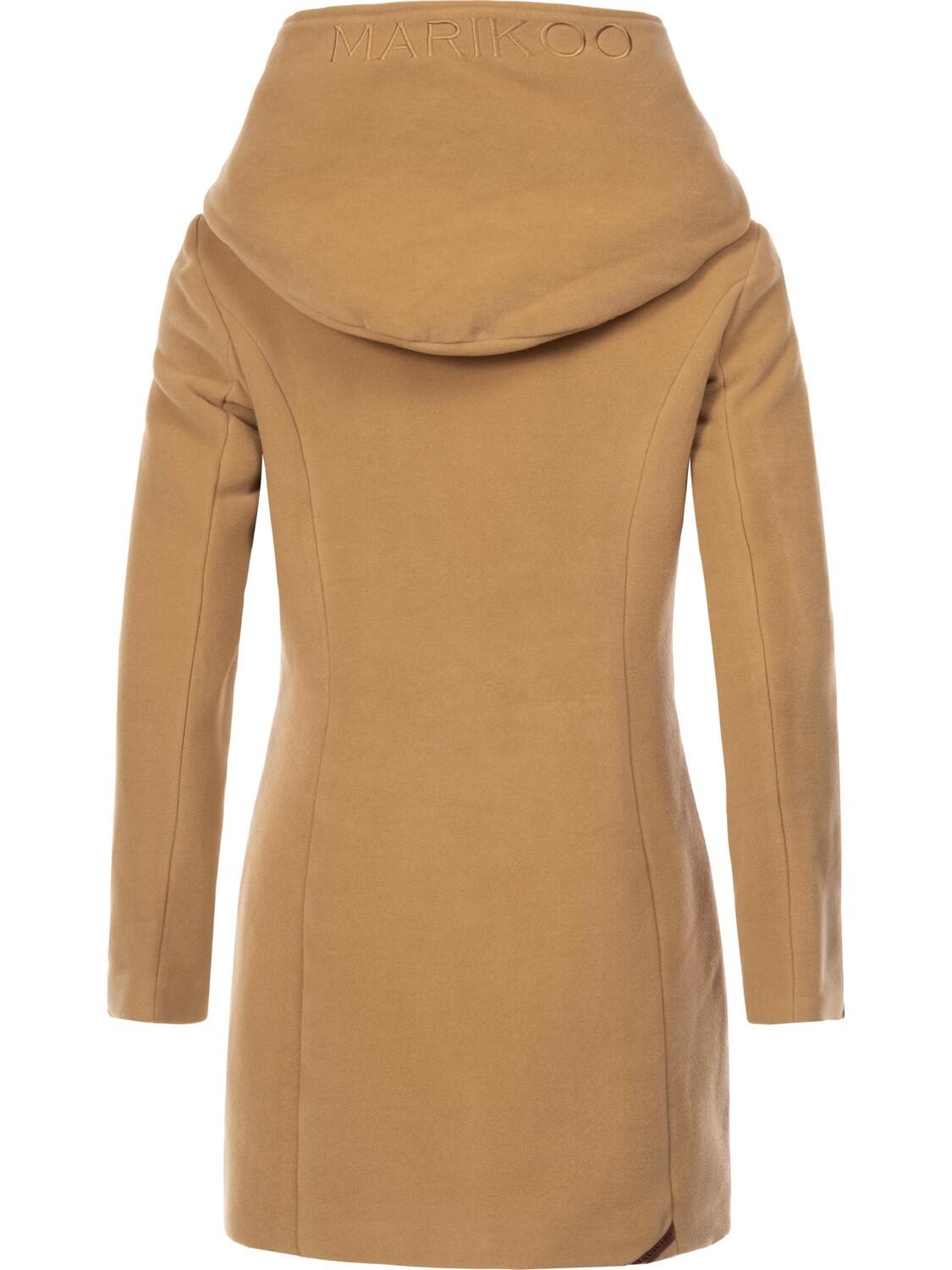 ВИД: Элегантное женское пальто в стиле шерстяного пальто с большим капюшоном от Marikoo, прекрасно сочетается с элегантными или городскими образами. МАТЕРИАЛ: Женское полупальто из мягкой внешней ткани в шерстяном стиле (не царапается), внутренняя подкладка сделана из бархатистой, блестящей, гладкой ткани. ФОРМА: Легкая зимняя куртка индивидуального покроя идеальной длины по низу, очень удобная в ношении. ДЕТАЛИ: Элегантная шерстяная куртка с планкой на кнопках перед передней молнией, большим практичным капюшоном с вышитым логотипом, большие боковые карманы