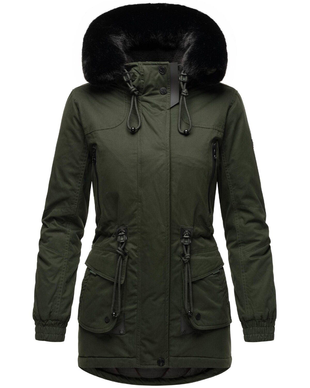 ВИД: Шикарное женское зимнее пальто с мягким искусственным мехом (съемным) на капюшоне, модными шнурами и пушистой подкладкой из меха тедди - идеальный компаньон в холодное время года (осень и зима). МАТЕРИАЛ: Бархатистый, матовый, мерцающий внешний материал из хлопок, внутренняя часть стегана внизу, а сверху выполнена из мягкого плюшевого меха, который приглашает вас уютно устроиться в нем.