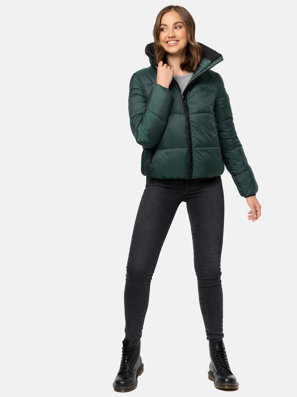 ВИД: Короткая женская зимняя стеганая куртка с высоким воротником-стойкой из рубчатого трикотажа модного кроя бомбера - идеальна для холодного сезона (осень и зима)