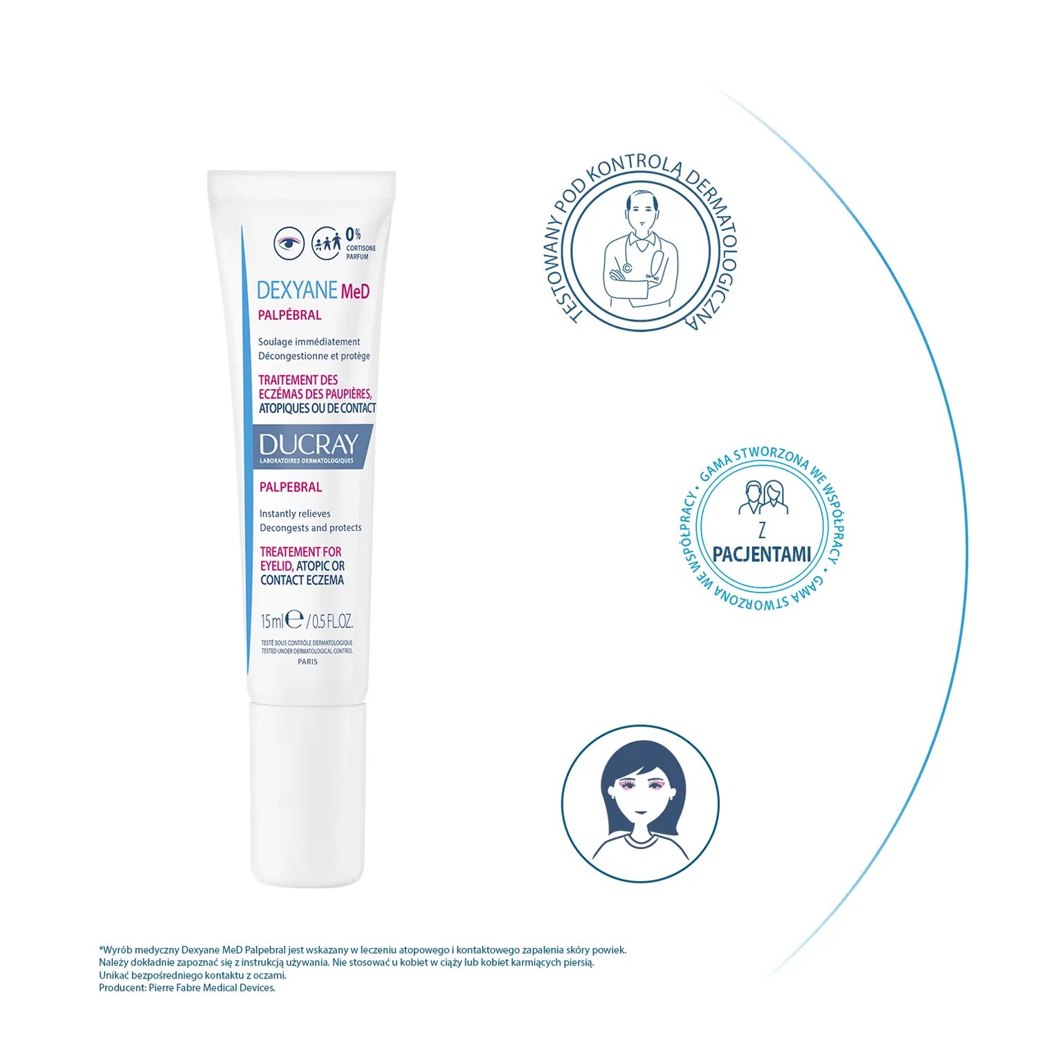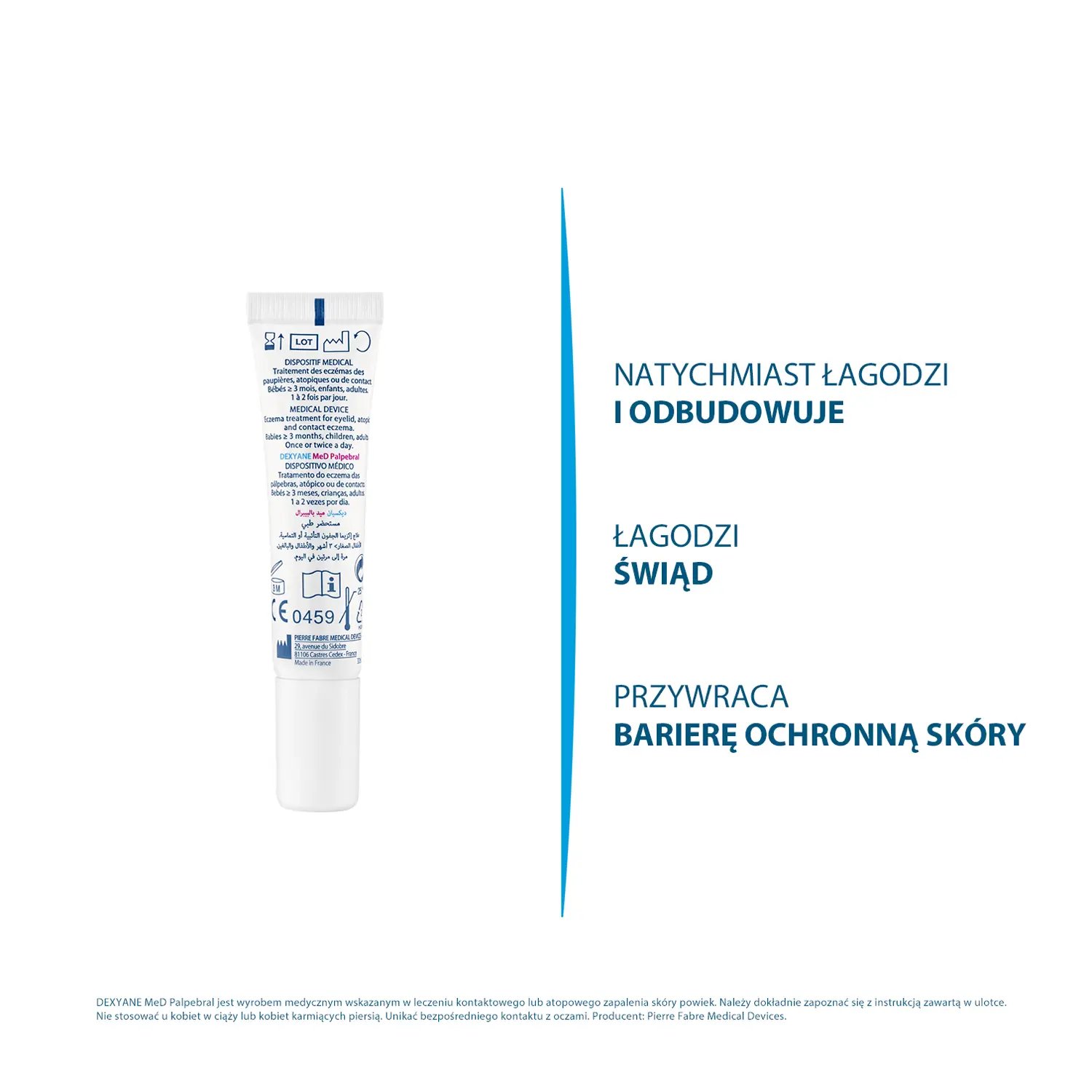 Действие препарата: Медицинский прибор Dexyane MeD Палпебрал показан для лечения атопического и контактного дерматита век. При экзематозных заболеваниях кожи происходит повреждение эпидермального барьера, что увеличивает риск возникновения реакций на аллергены и раздражители (таких как сухость, раздражение и зуд кожи).