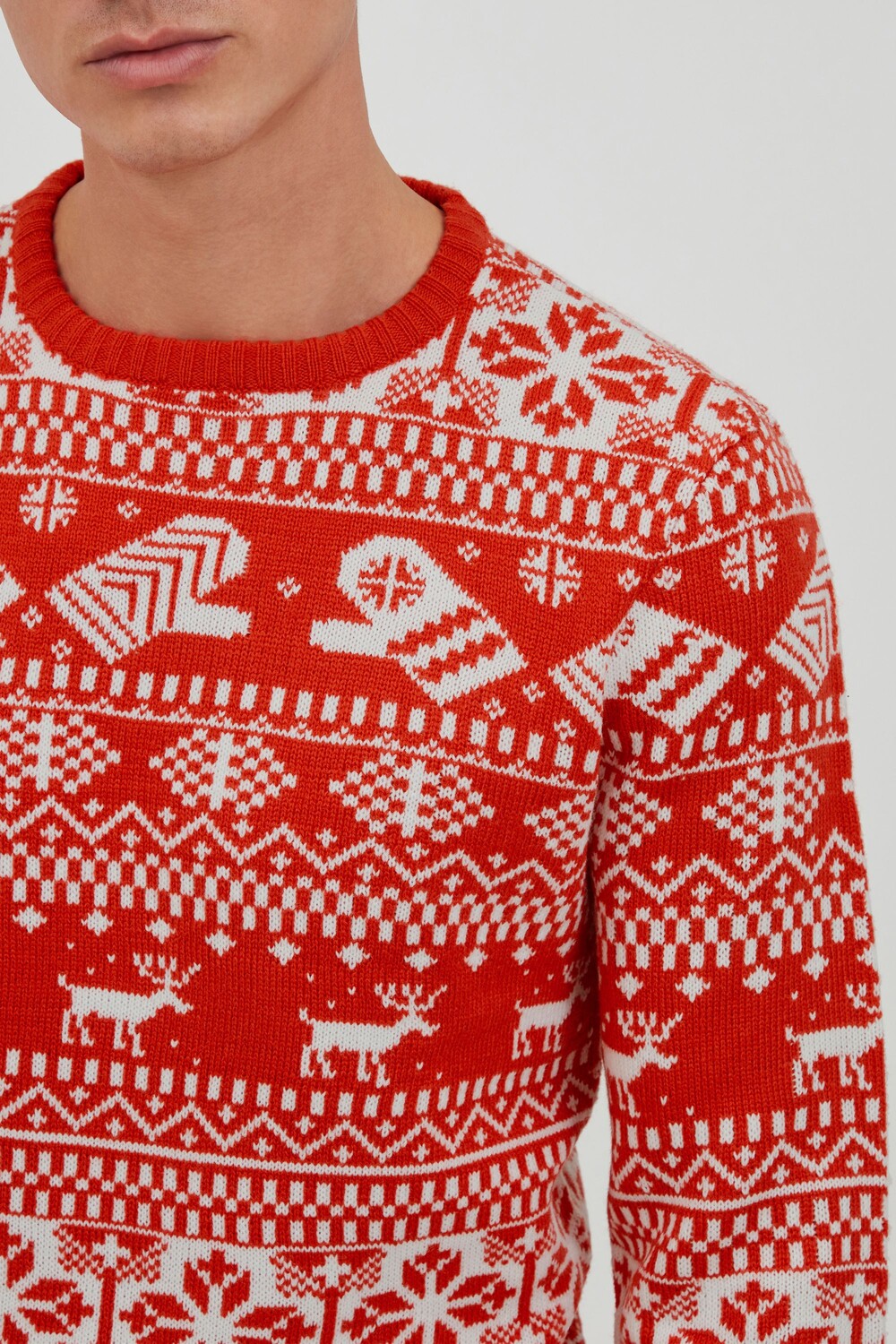 ДЕТАЛИ И ОСОБЕННОСТИ: Вязаный свитер с круглым вырезом, рождественский вязаный узор, белая тканевая нашивка по нижнему краю, эластичные ребристые манжеты по краю и рукавам, приятный мягкий материал.