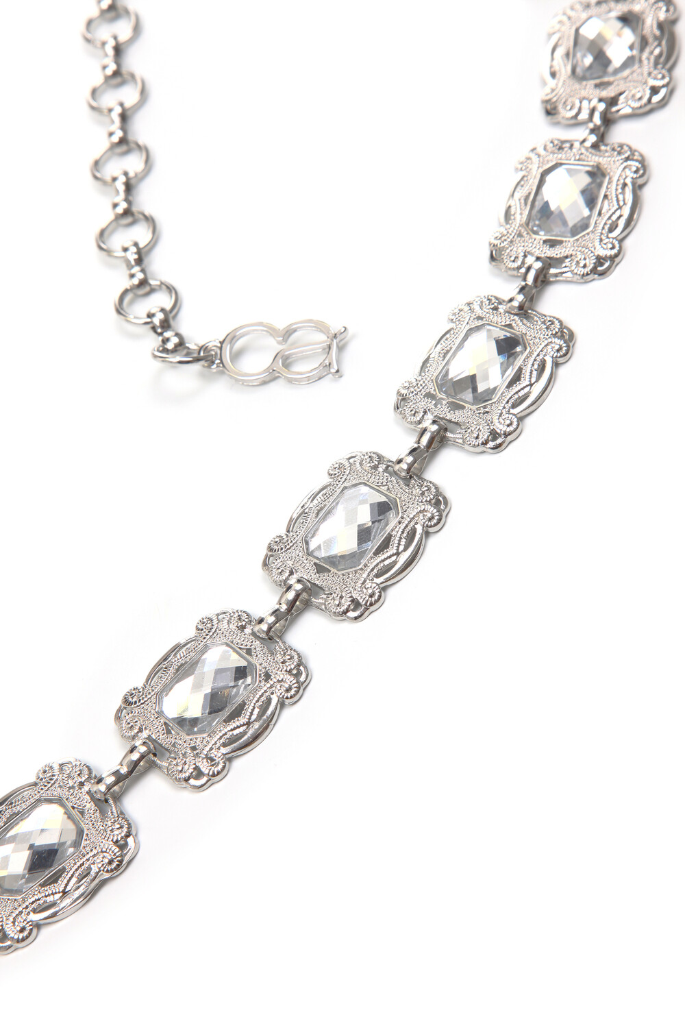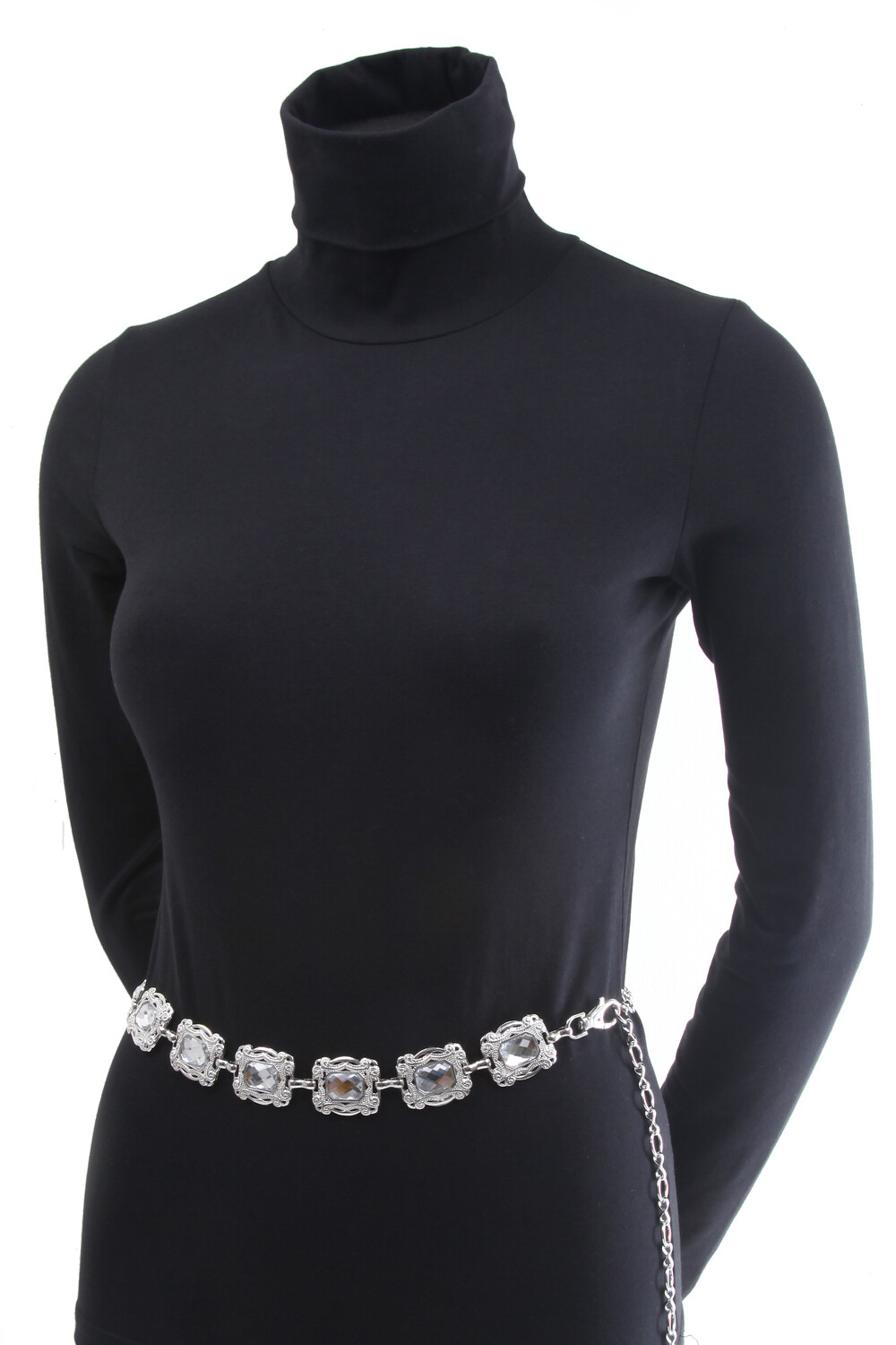 Ремень-цепочка с карабином производства Италия. Ремень элегантного дизайна состоит из 9 элементов квадратной формы с крупным камнем. Общая длина около 120 см, регулируется индивидуально. Подходит до размера XL.