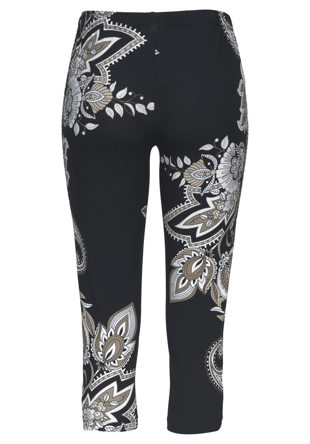 Леггинсы от Lascana длиной 3/4. Эластичный пояс. Ножка заканчивается двумя декоративными лентами сбоку. Благодаря сплошному принту каждое изделие уникально. Внутренняя длина штанины около 54 см. Эластичный материал: 92 % хлопка (поддерживается хлопок, произведенный в Африке), 8 % эластана.