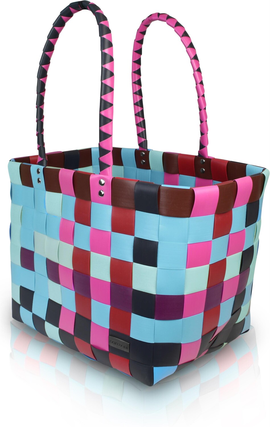 Легкая разноцветная плетеная пластиковая корзина идеально подходит в качестве корзины для покупок или модной пляжной сумки в отпуске. В частности, это связано с прочной пластиковой сеткой, поскольку используемые полиэтиленовые ремни прочны, водоотталкивающи и просты в уходе. Просто протрите влажной тряпкой или поместите прямо под душ, и ваша любимая вещь будет чистой! Благодаря гибкой конструкции корзину можно наполнять как сумку для переноски.