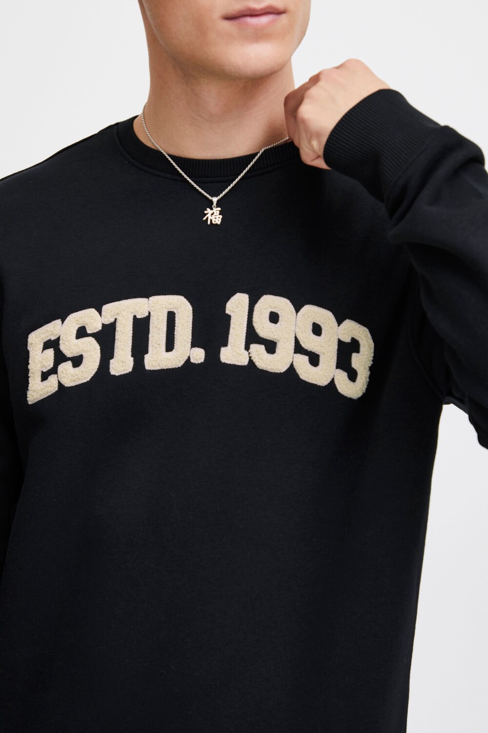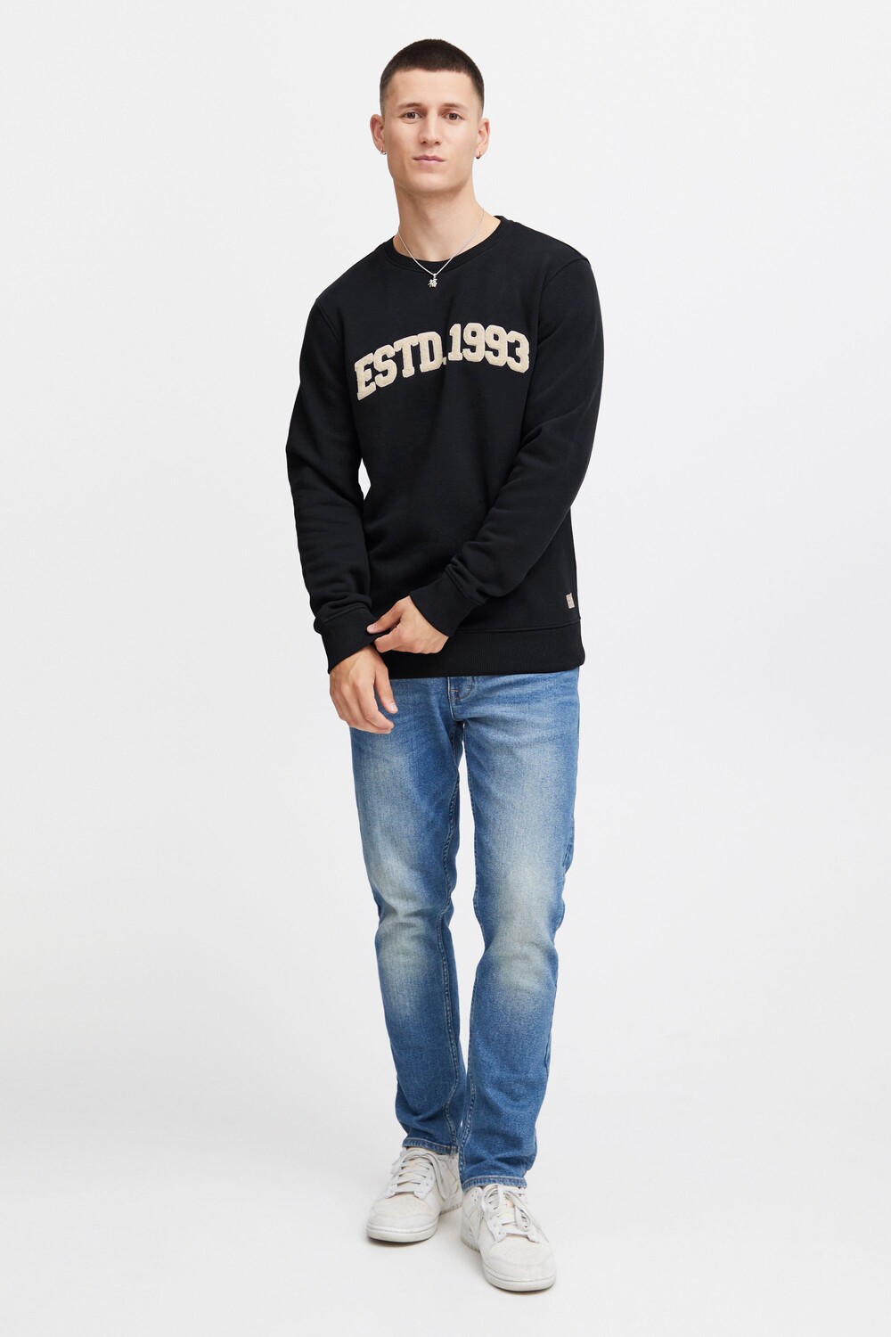 ДЕТАЛИ И ОСОБЕННОСТИ: пуловер, стандартный крой, тканевая нашивка, круглый вырез горловины, ребристый низ, стандартные рукава с ребристыми манжетами, высококачественный хлопковый материал, флок спереди в студенческом стиле.