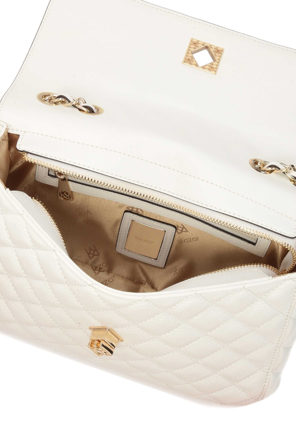 Женская сумка из высококачественной лицевой кожи имеет неподвластный времени дизайн и модную стежку. Неповторимую красоту и элегантность этой модели подчеркивают вневременной белый цвет и золотая цепочка на плечо. Витая монограмма KAZAR, эффектно закрывающая клапан, придает ему эксклюзивный характер. Стильная сумочка – неотъемлемый элемент классического стиля.