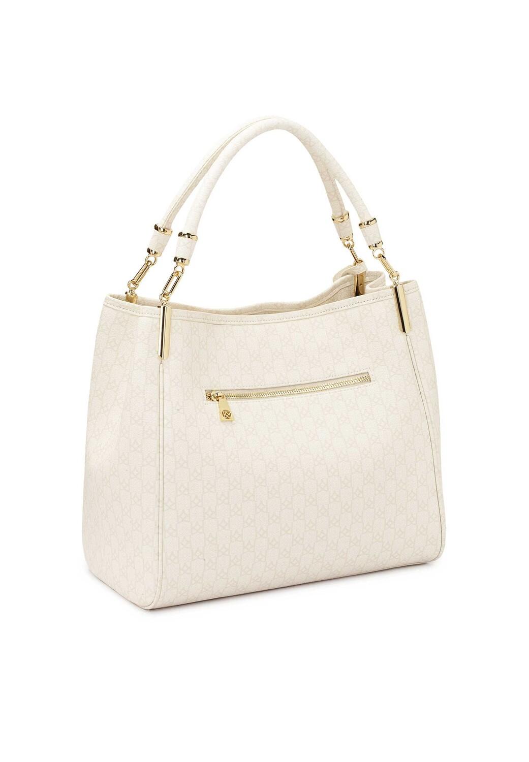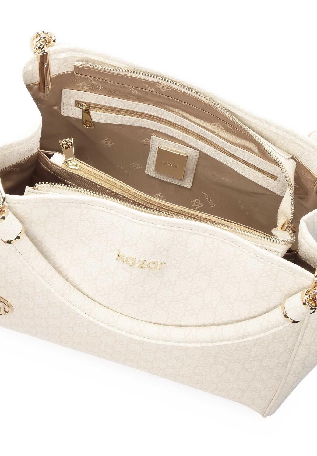 Классическая сумка из высококачественной зерненой кожи – идеальная модель для женщин, которые ищут простую, но неординарную сумочку. Минималистичный крой дополнен эффектным узором из регулярно расположенных монограмм KAZAR. Мягкая кожа приятна на ощупь и повышает комфорт при ношении. Минималистичный крой приобретает элегантность благодаря тонкому декору в виде кулона с логотипом KAZAR и красивой золотой фурнитурой на ручках.