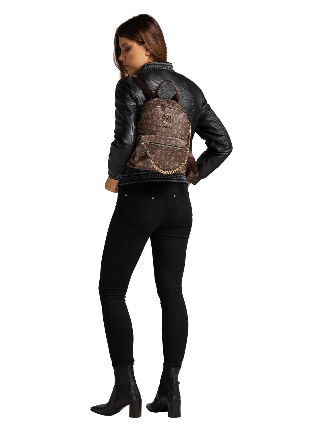 С этим рюкзаком тебя видно. Он не только впечатляет привлекательным узором и золотой цепочкой, но и функционален. Основное отделение предлагает множество вариантов хранения и легко открывается и закрывается на молнию. Отличный компаньон для следующего похода по магазинам или посещения парка.