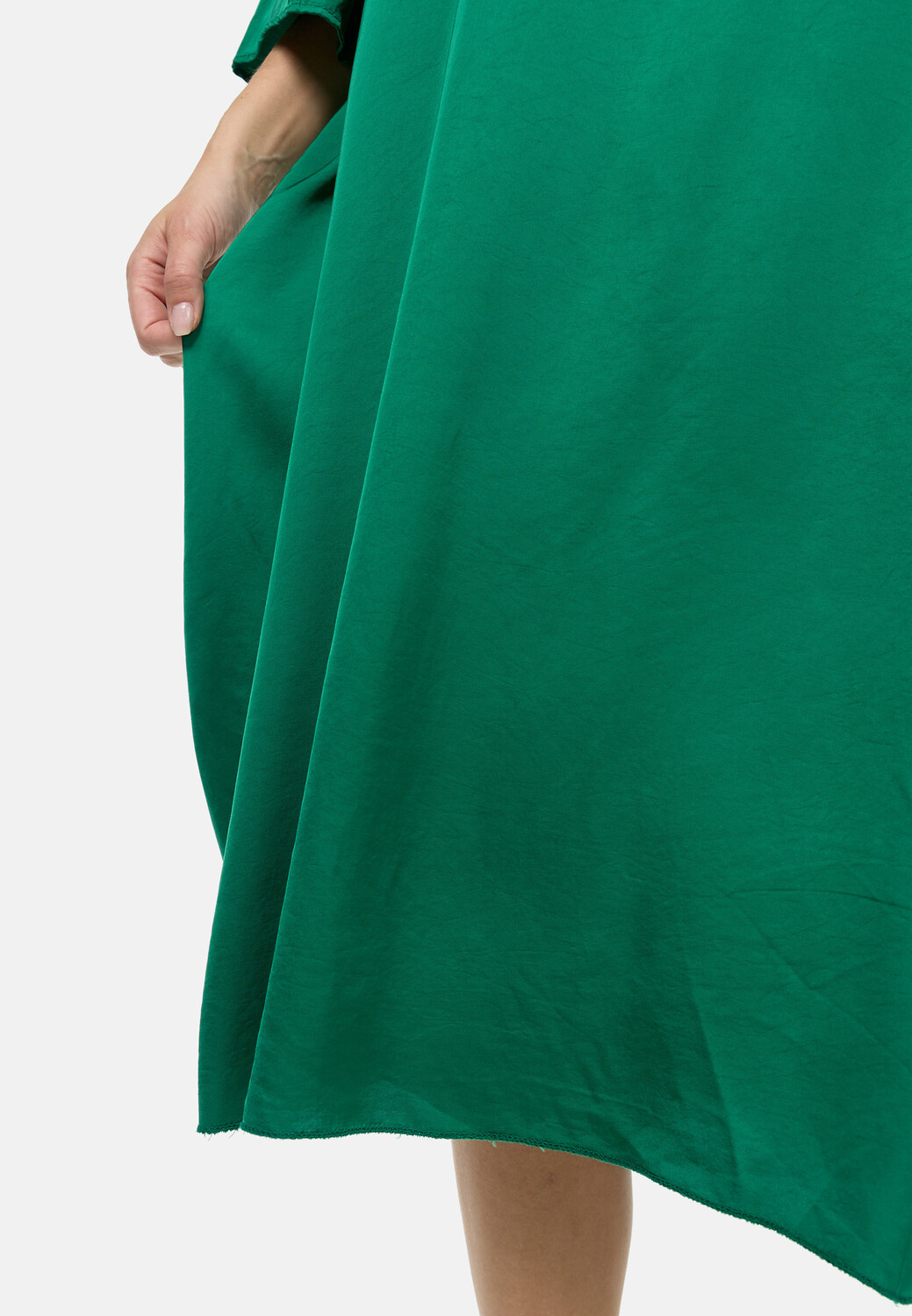 Элегантное, элегантное женское платье-макси-туника с вставкой из настоящего шелка. Мягкая, струящаяся ткань подчеркивает фигуру и невероятно легка в носке. Гладкий, мерцающий атласный материал приятно охлаждает кожу и обеспечивает высокий уровень комфорта. V-образный вырез без воротника подчеркивает элегантный дизайн длинного шелкового платья и имеет качественный пояс. Рукава-колокол длиной 3/4, слегка присборенные у плеча, заканчиваются ниже локтя и имеют широкий вырез. Платье-макси с добавлением шелка имеет А-образный крой оверсайз, широко и свободно облегает фигуру. Модный крой маллет, более длинный сзади, чем спереди, дополняет модный дизайн. Длина примерно до середины икры.