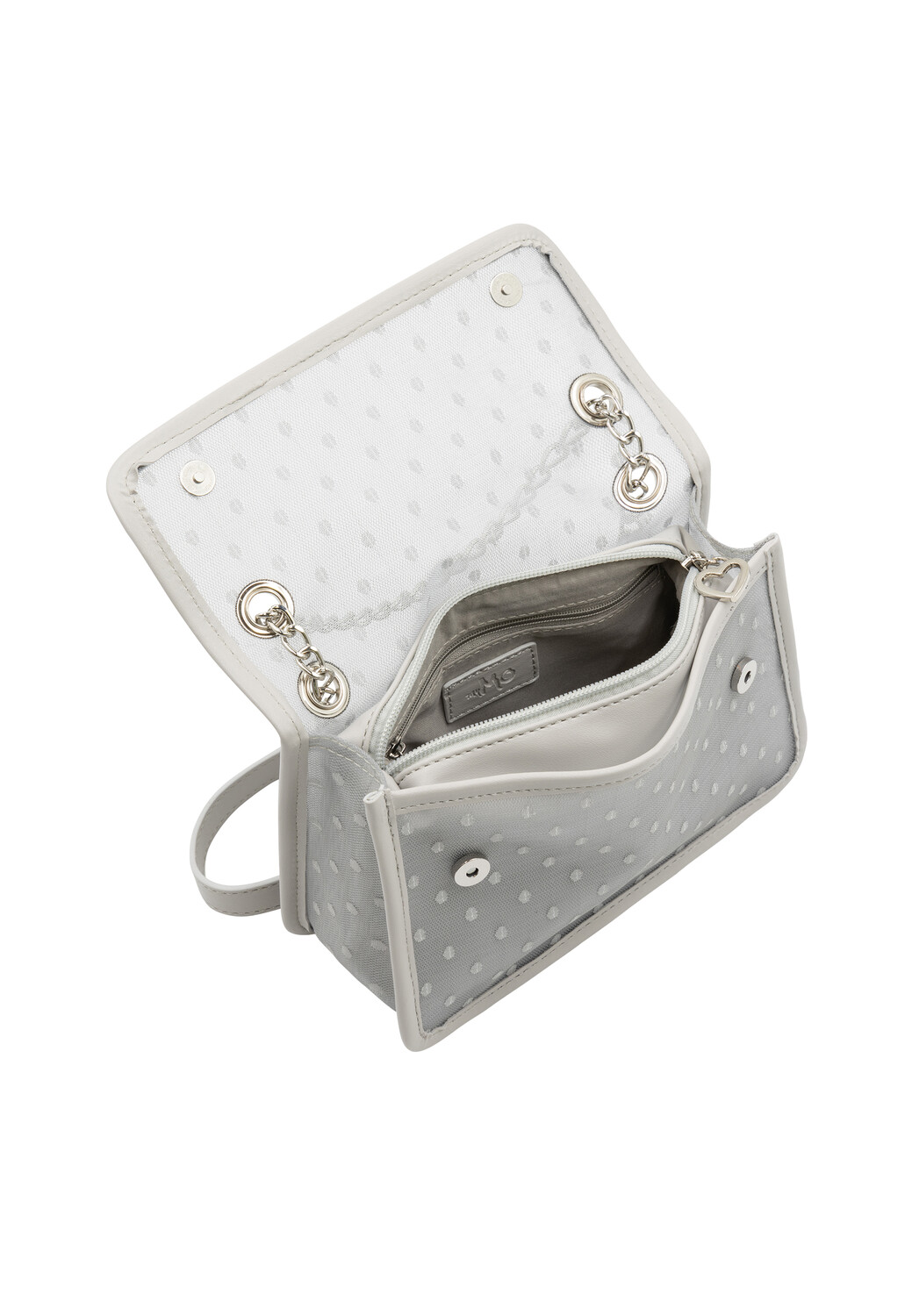 Маленькая сетчатая сумка через плечо от myMo придаст вашим нарядам волшебный шарм. Полупрозрачный дизайн расшит по всей поверхности горошком и окантован тонкой искусственной кожей. Цепочка из звеньев серебристого цвета с плечевой частью из искусственной кожи предлагает различные варианты ношения, которые идеально подчеркивают аксессуар. Застежка-молния с подвеской-сердечком надежно сохранит все необходимое.
