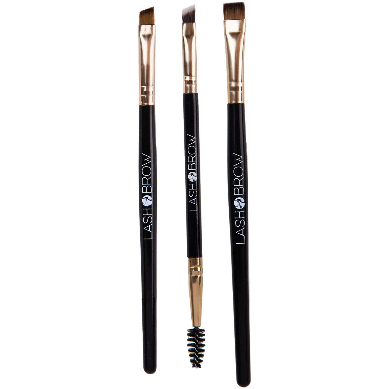 Набор из 3 кистей GOLD Lash Brow Набор из 3 кистей для макияжа бровей В набор входят: - прямая кисть 14 см, синтетическая щетина - наклонная кисть 14 см, синтетическая щетина - наклонная кисть с кистью, 15 см, синтетическая щетина Идеальные кисти для макияжа бровей - хна, помадные тени. Можно дезинфицировать