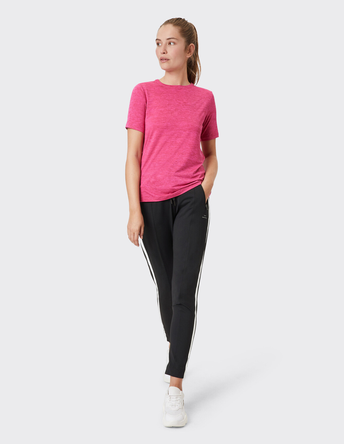 Удобный универсал также впечатляет оптимальной свободой движений благодаря эластичному поясу с завязками и прямому крою брючин. Будь то энергичная тренировка или уютный вечер на диване.